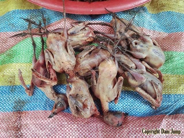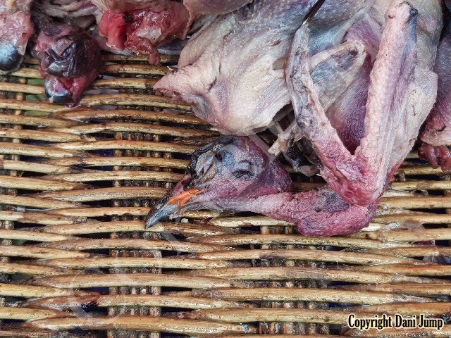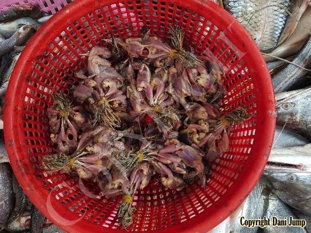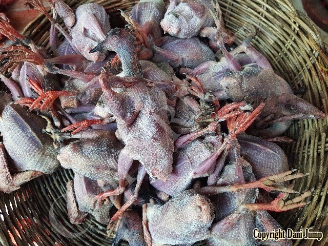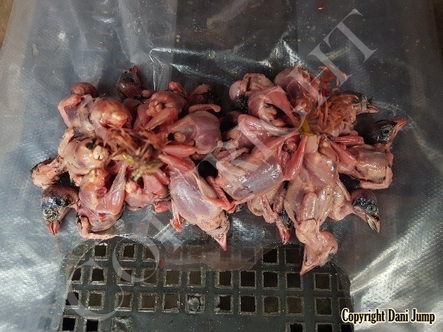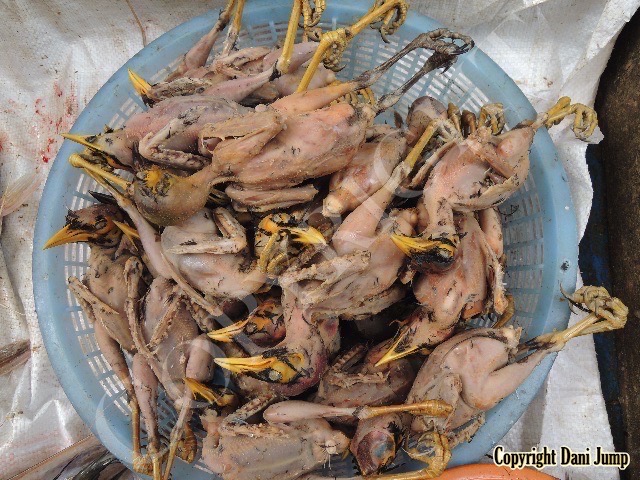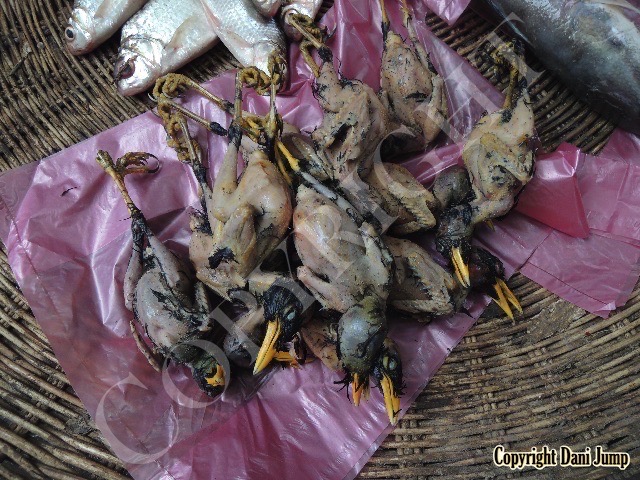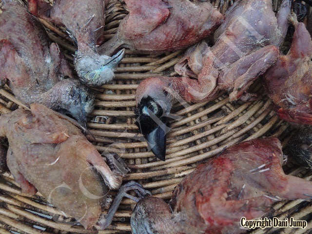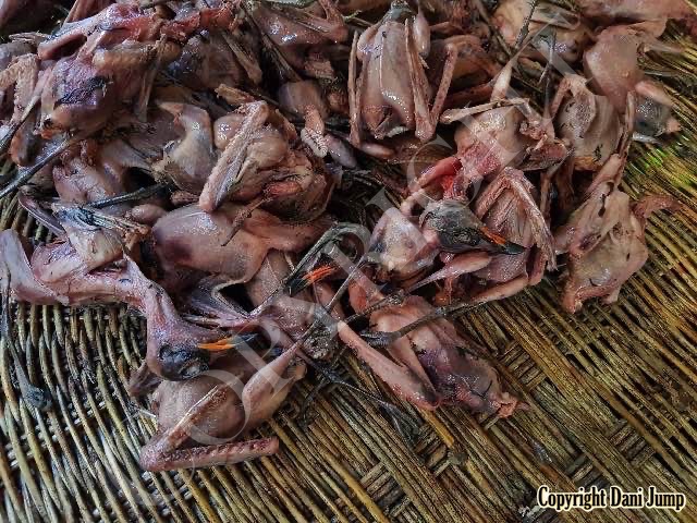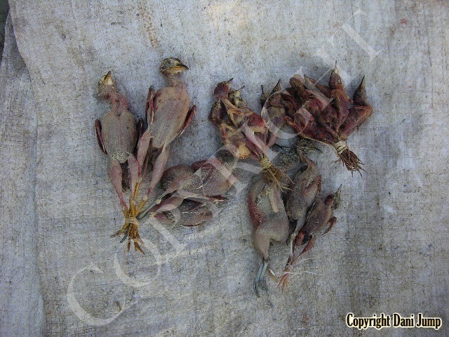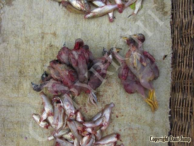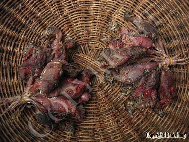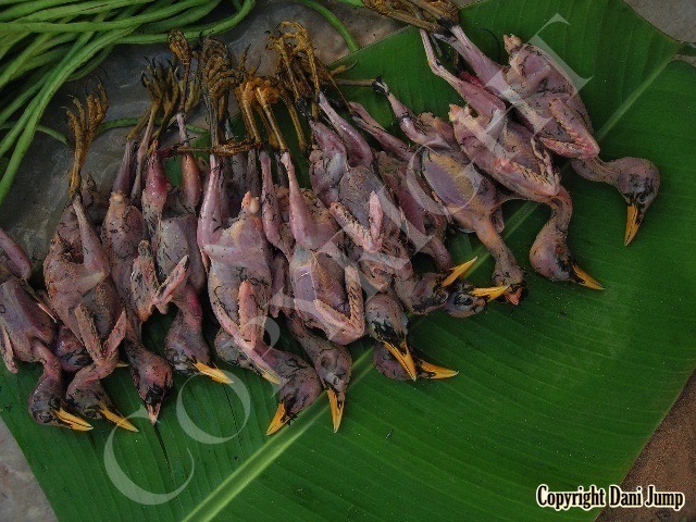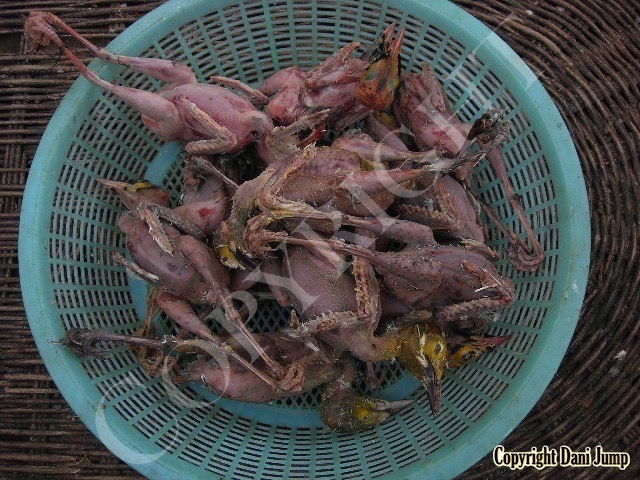 In Cambodia, most everything that moves is edible--even Indian rollers and beautiful bee-eaters. Other birds... owls, larks, finches, sparrows, doves, pigeons, parrots, mynas, starlings, kingfishers, cuckoos, crow pheasants, and pratincoles also find themselves on the menu.