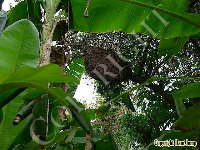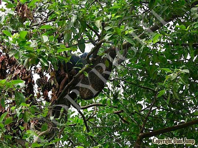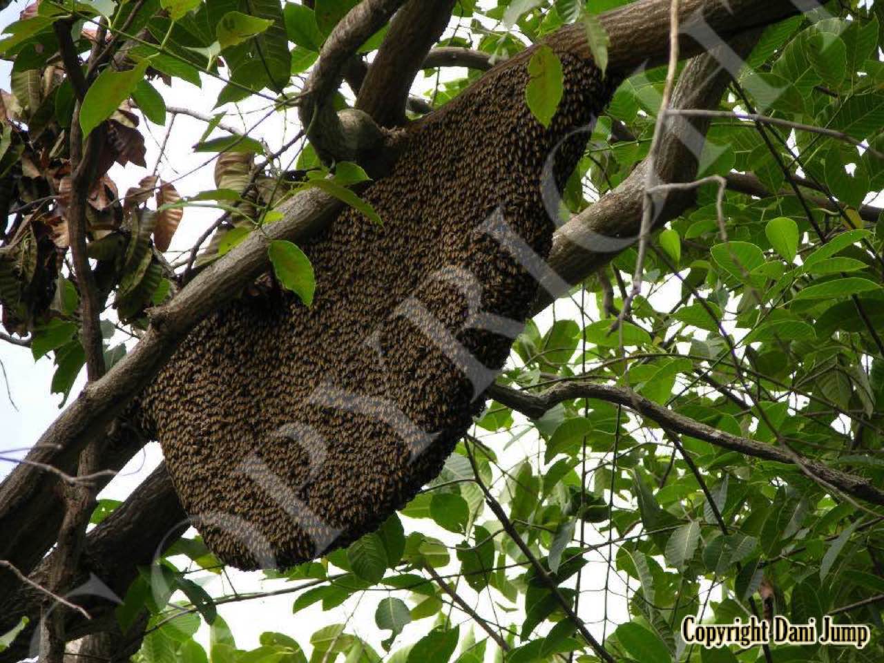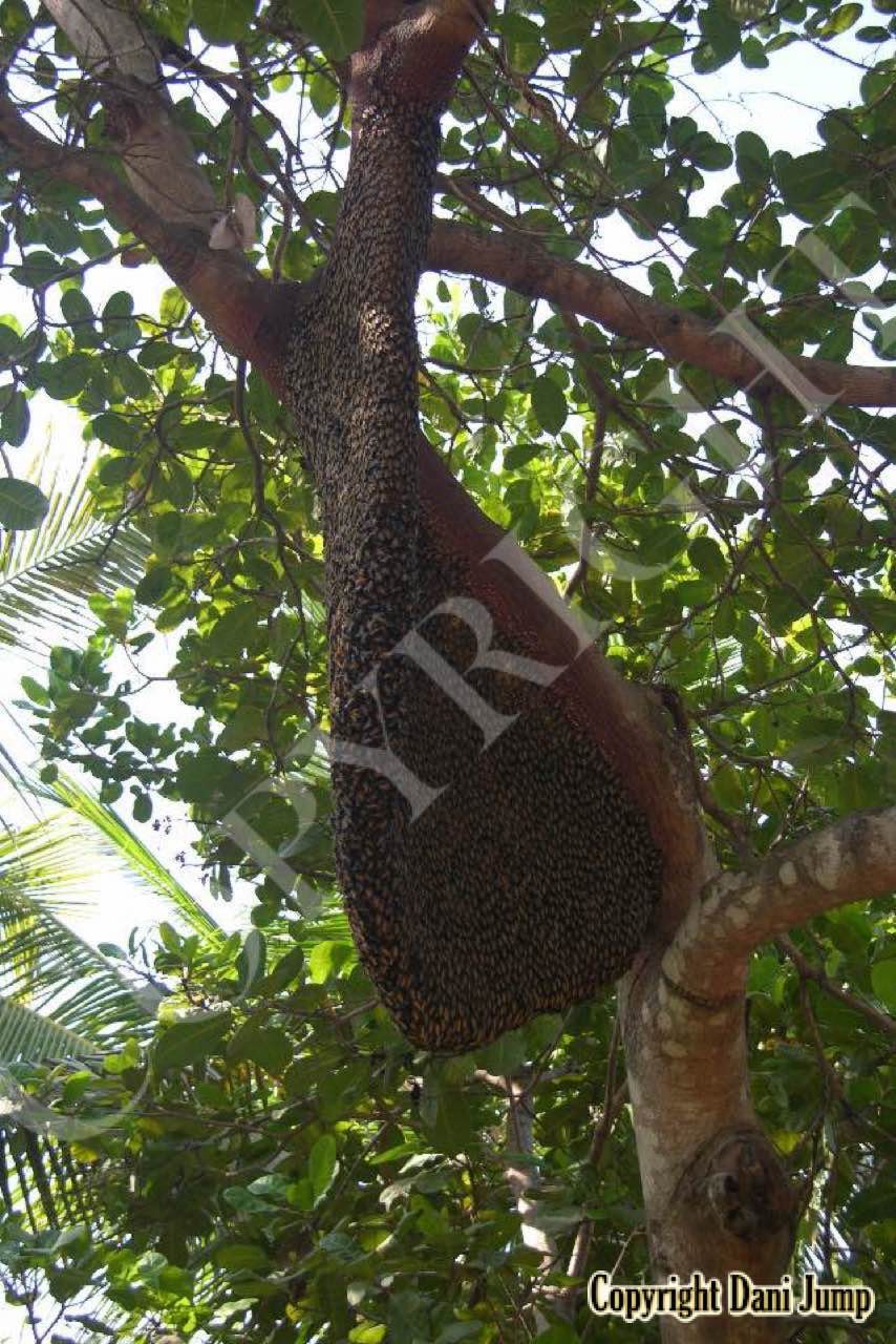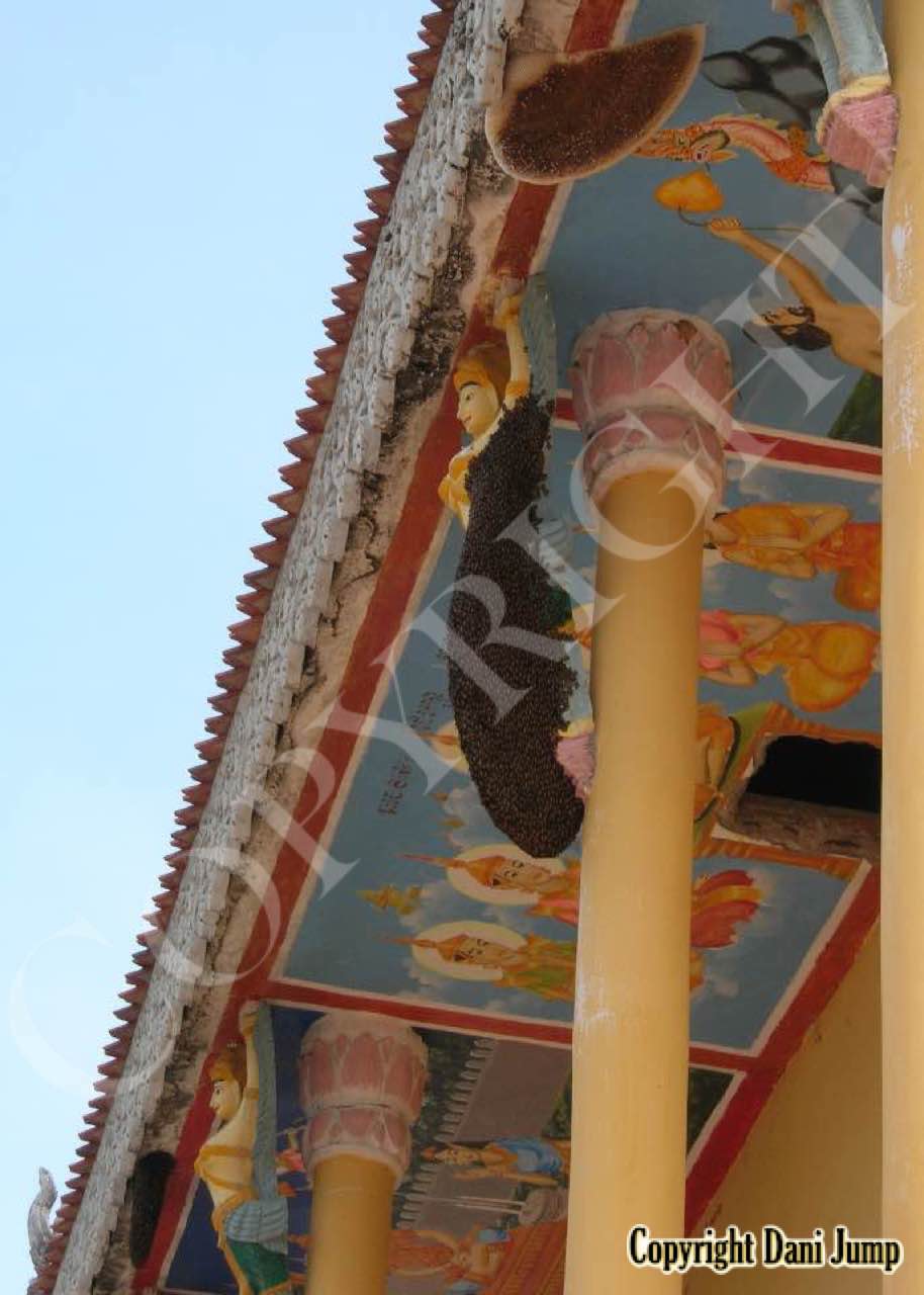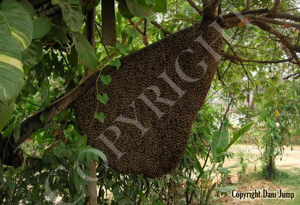 These giants of the honeybee world, exploited traditionally in Cambodia for their honey and wax, as well as their larvae, produce copious amounts of honey, and are the bees of choice for local honey-hunters. Migratory in nature, nesting high up under the tall tree canopy, very low to the ground, or anywhere in between, they are as equally at home in a small town or large city as they are in the countryside or forest. Their oft-enormous single-comb colonies (that need to be seen to be believed!) and aggressively defensive demeanor make them unsuitable candidates for domestication. Rafter beekeeping, however, allows honey-hunters easy access to feral colonies, which, when smoked, are readily exploited with minimum fuss.