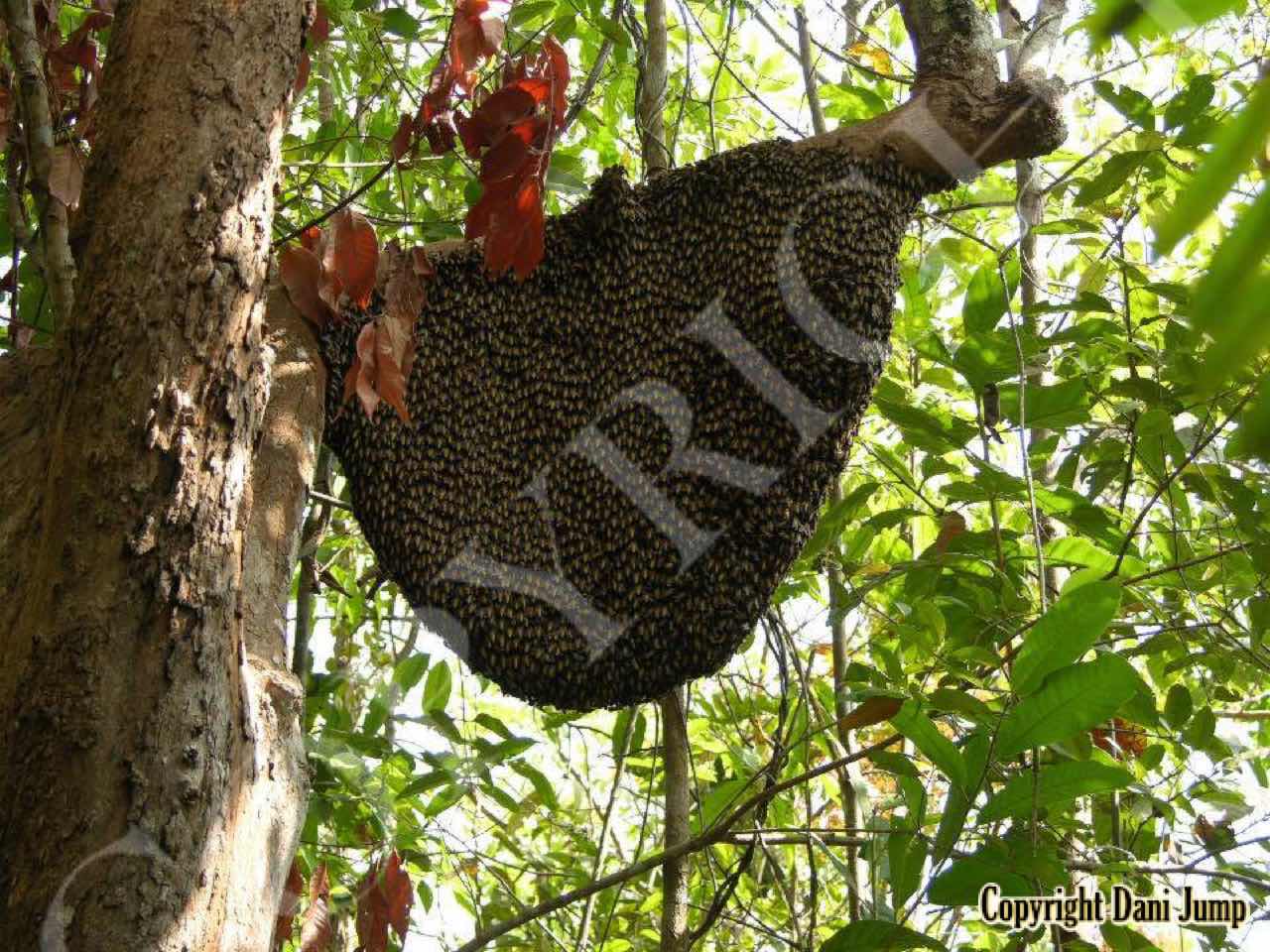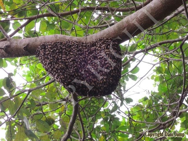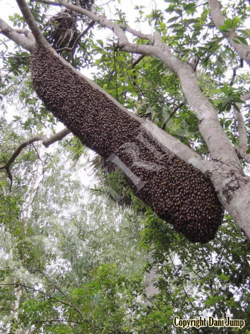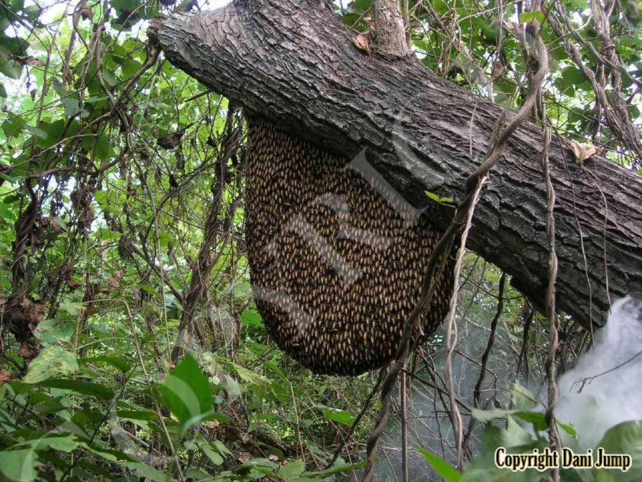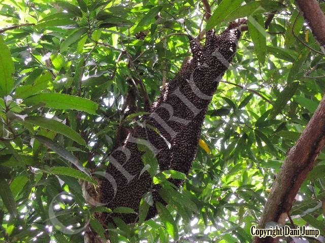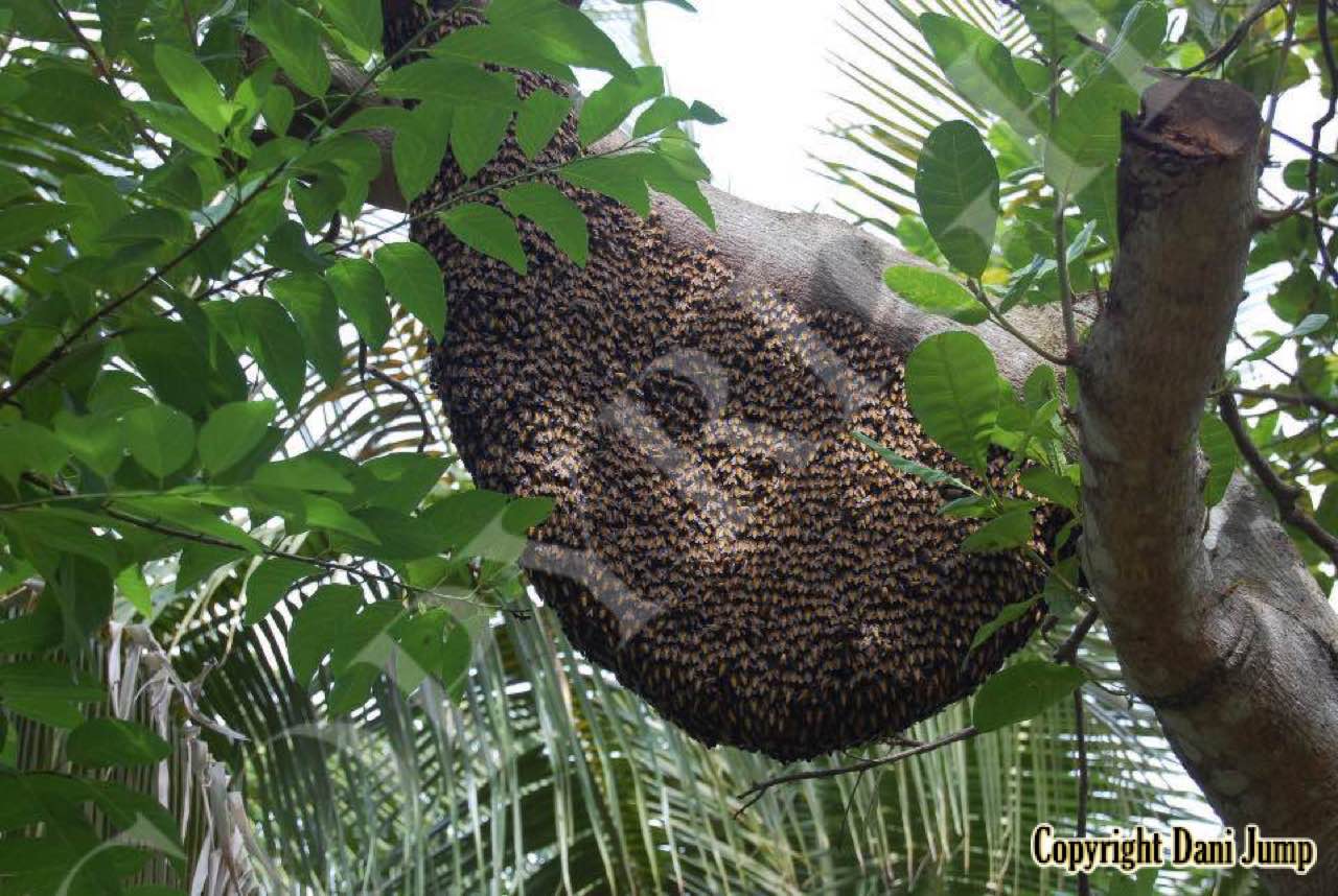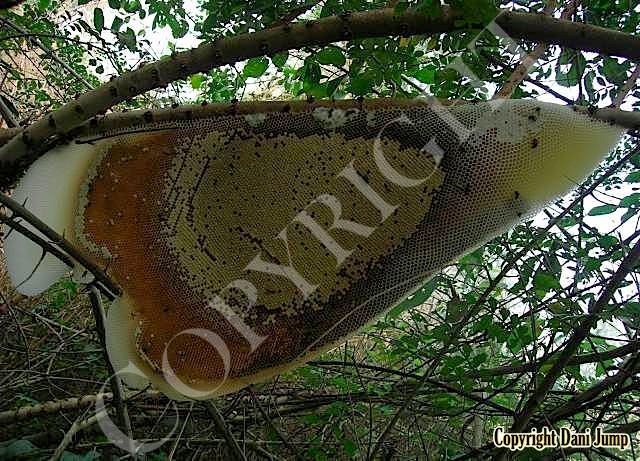 These giants of the honeybee world, exploited traditionally in Cambodia for their honey and wax, as well as their larvae, produce copious amounts of honey, and are the bees of choice for local honey-hunters. Migratory in nature, nesting high up under the tall tree canopy, very low to the ground, or anywhere in between, they are as equally at home in a small town or large city as they are in the countryside or forest. Their oft-enormous single-comb colonies (that need to be seen to be believed!) and aggressively defensive demeanor make them unsuitable candidates for domestication. Rafter beekeeping, however, allows honey-hunters easy access to feral colonies, which, when smoked, are readily exploited with minimum fuss.