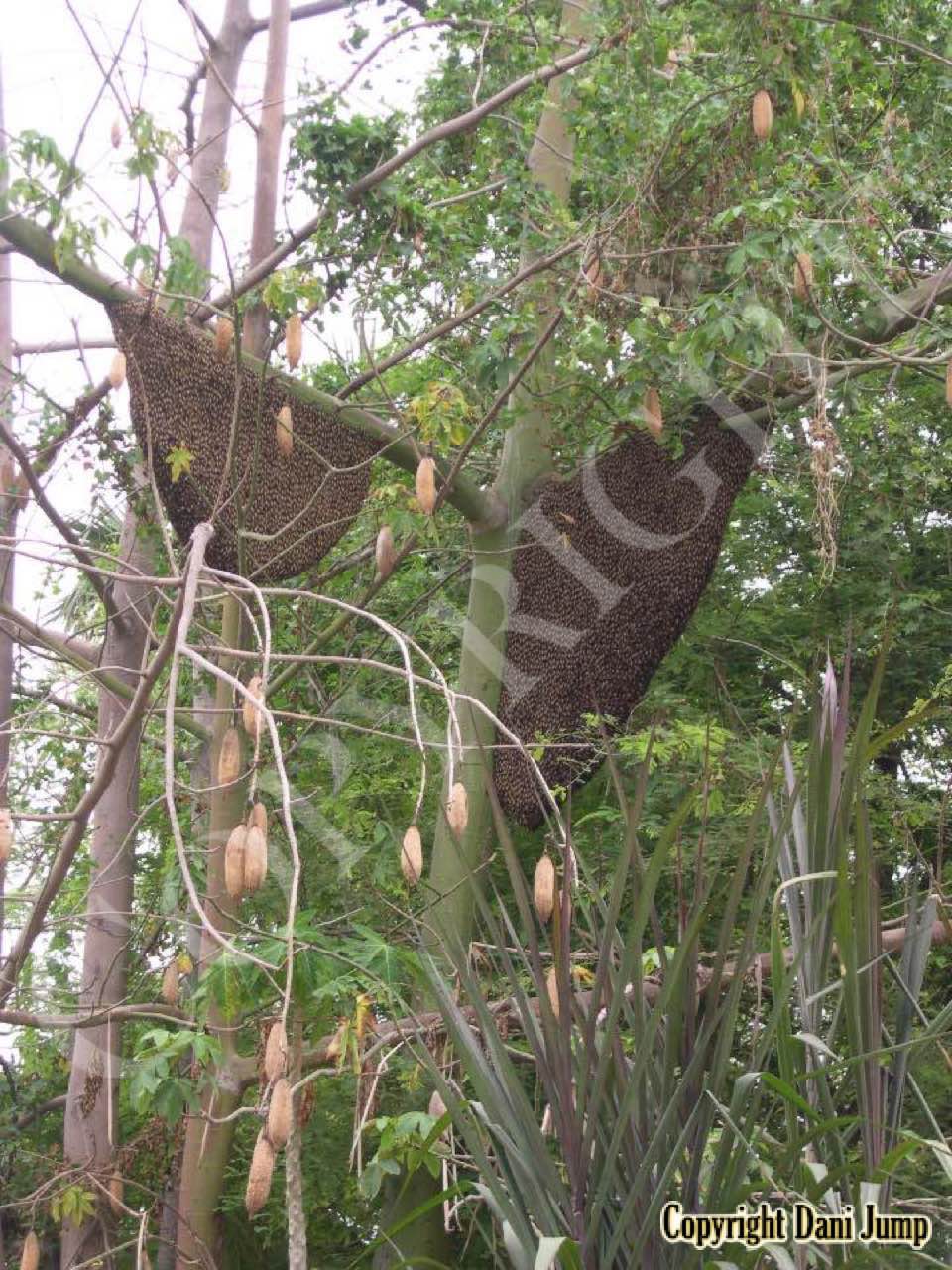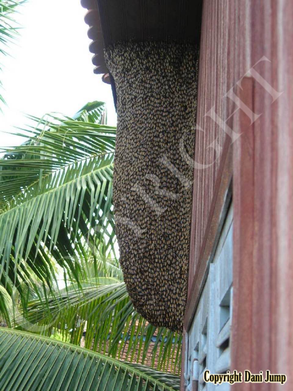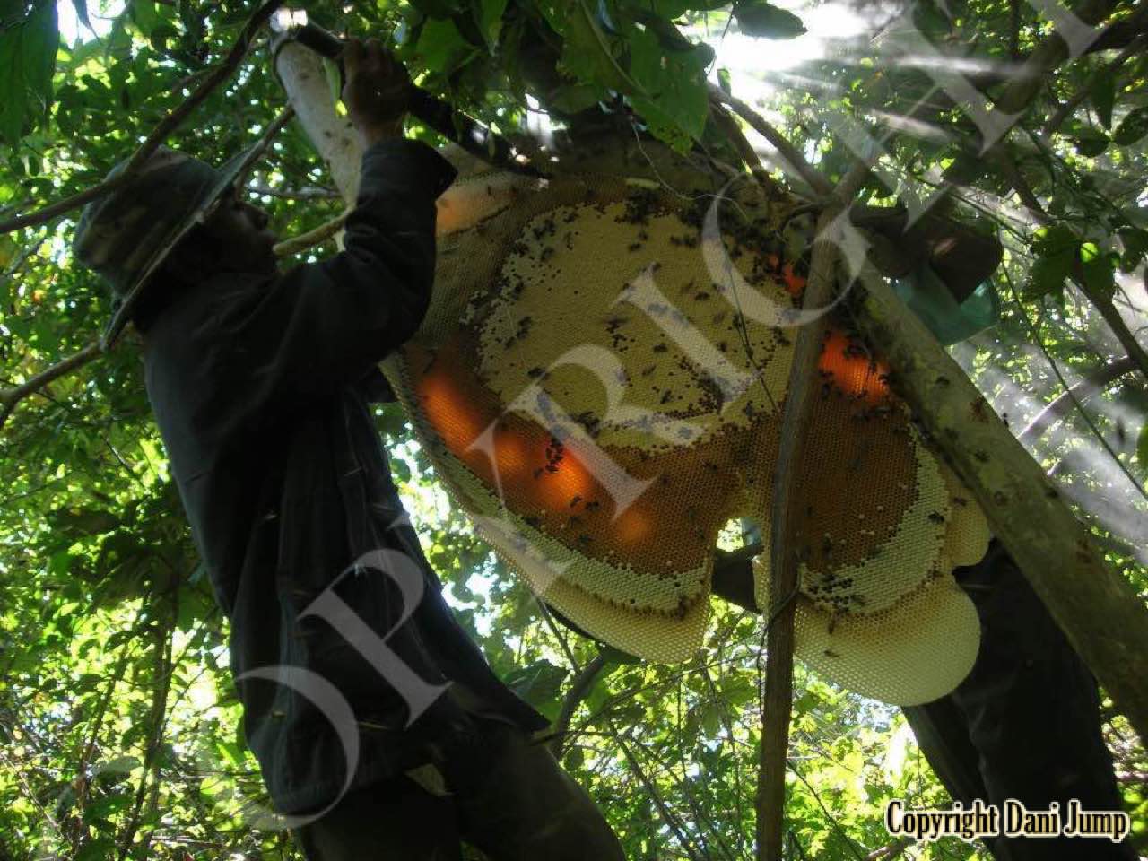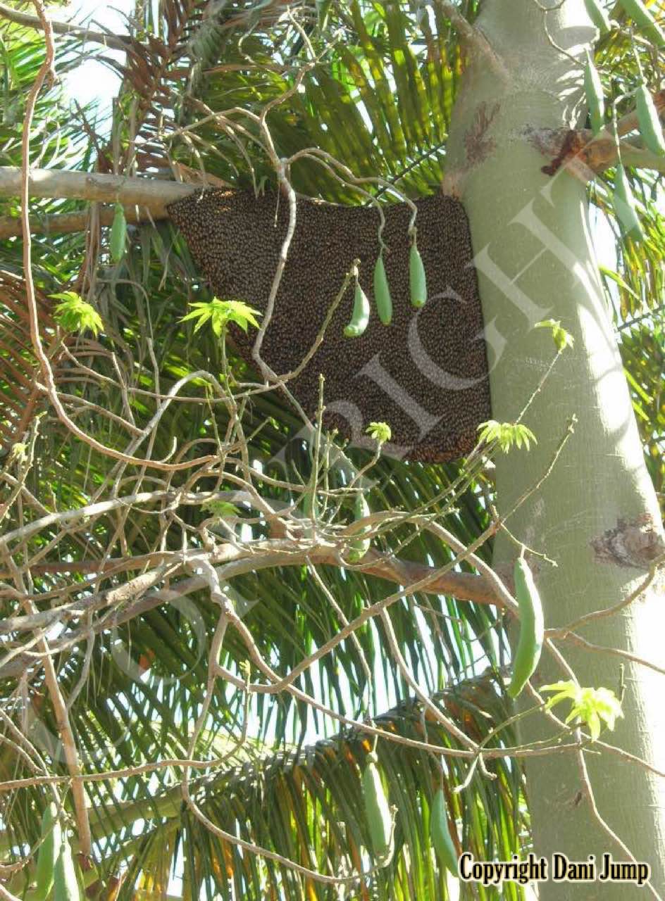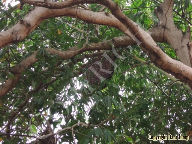 These giants of the honeybee world, exploited traditionally in Cambodia for their honey and wax, as well as their larvae, produce copious amounts of honey, and are the bees of choice for local honey-hunters. Migratory in nature, nesting high up under the tall tree canopy, very low to the ground, or anywhere in between, they are as equally at home in a small town or large city as they are in the countryside or forest. Their oft-enormous single-comb colonies (that need to be seen to be believed!) and aggressively defensive demeanor make them unsuitable candidates for domestication. Rafter beekeeping, however, allows honey-hunters easy access to feral colonies, which, when smoked, are readily exploited with minimum fuss.