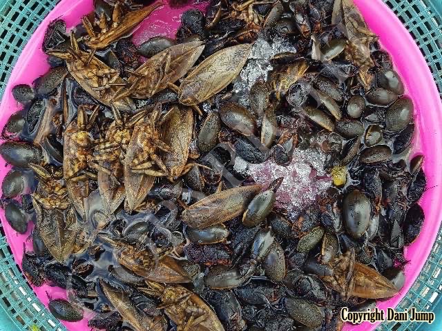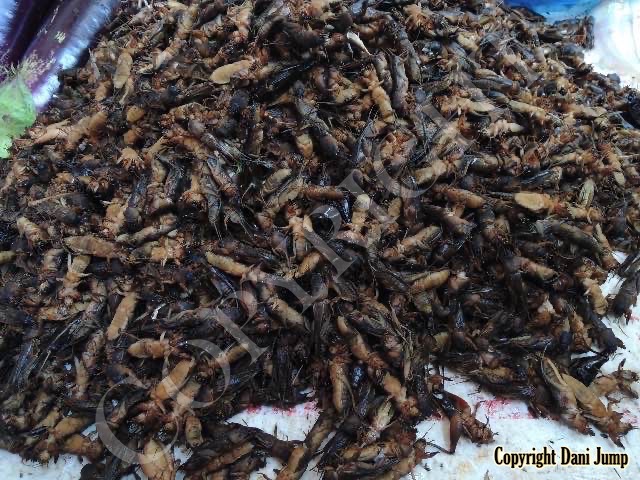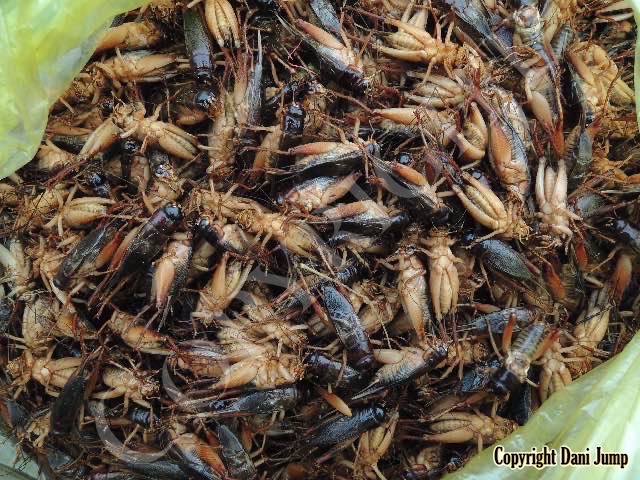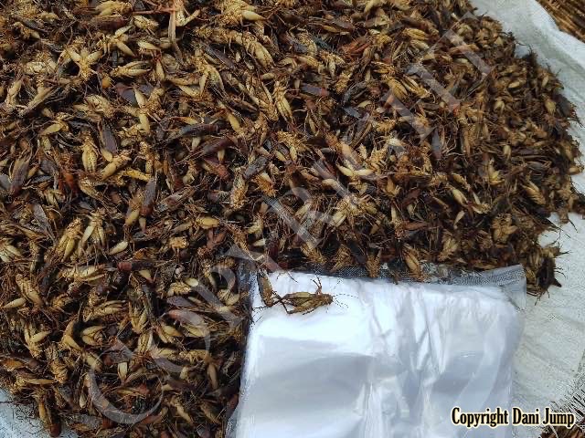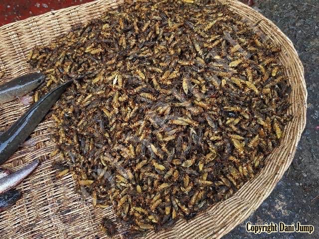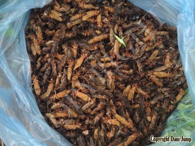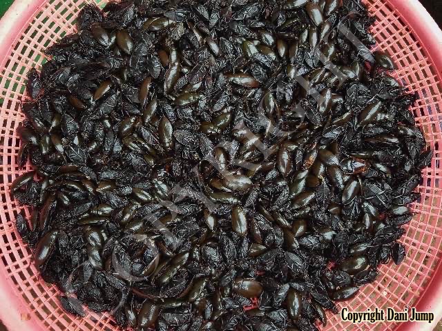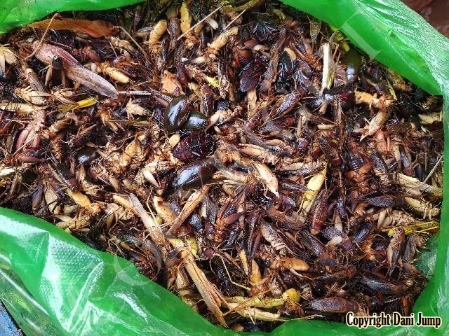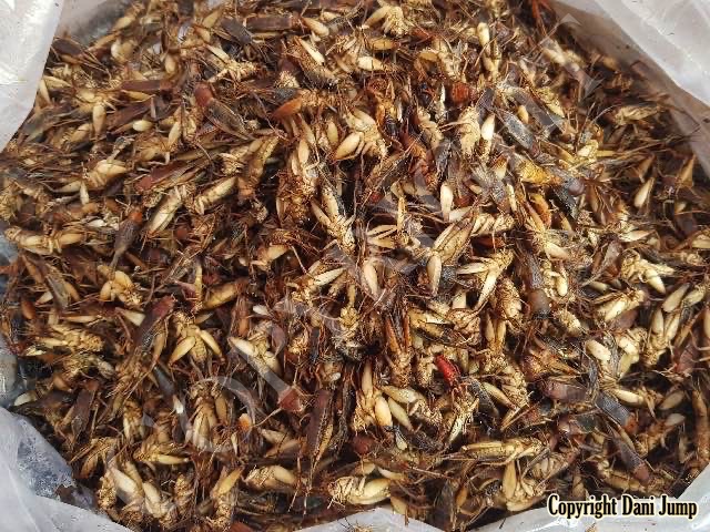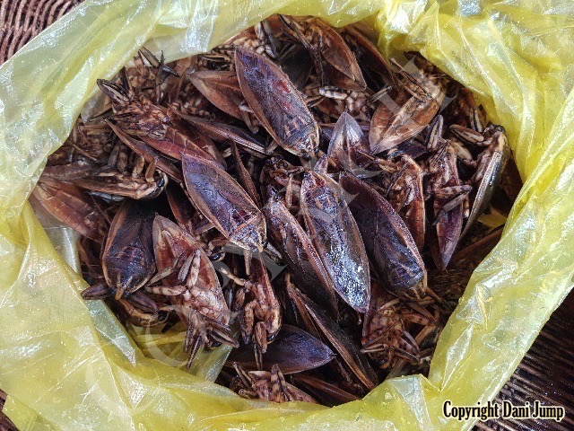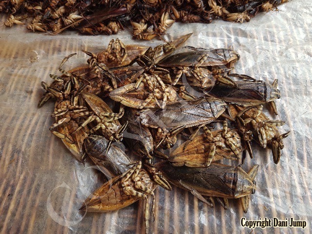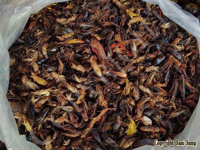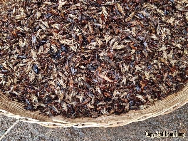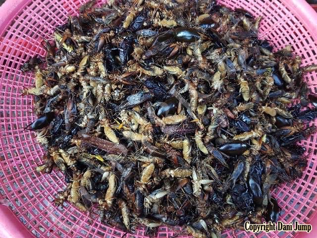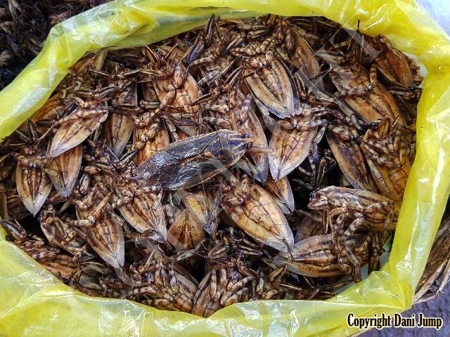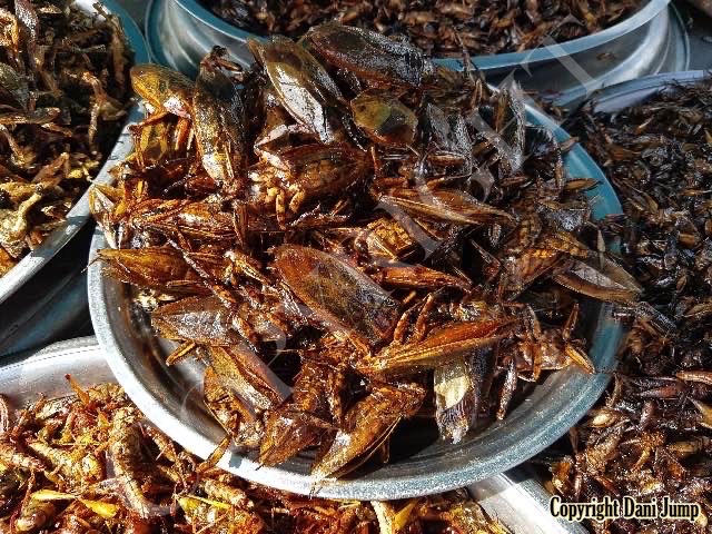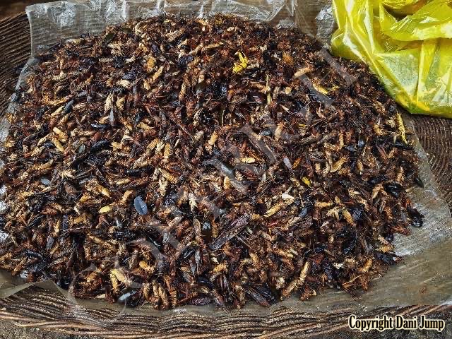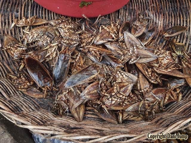 Below are some 'snack food' samples from Siem Reap… abundant particularly during the rainy season, when grasshoppers, crickets, beetles, and bugs are collected at light traps, then taken by bag, basket, or bucket to local markets, and sold raw or deep-fried-and-ready-to-eat, garnished with spring onions, garlic, chillies, and seasoning salt.
