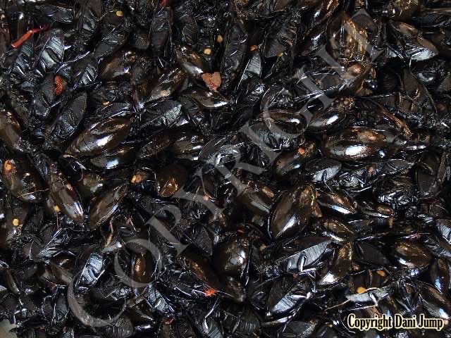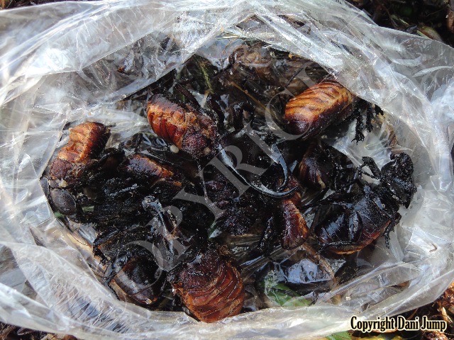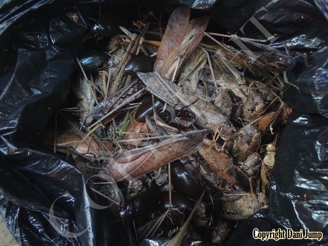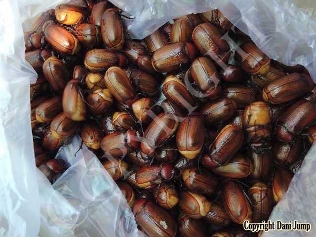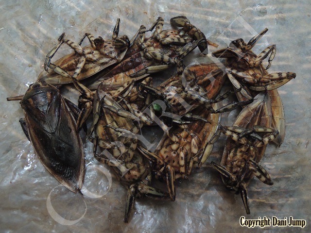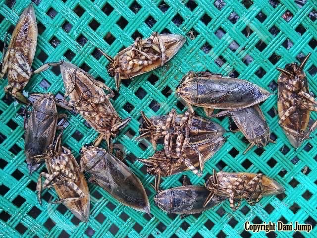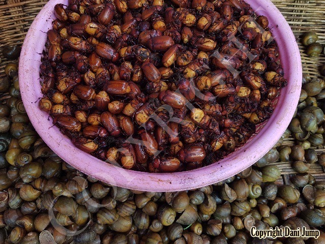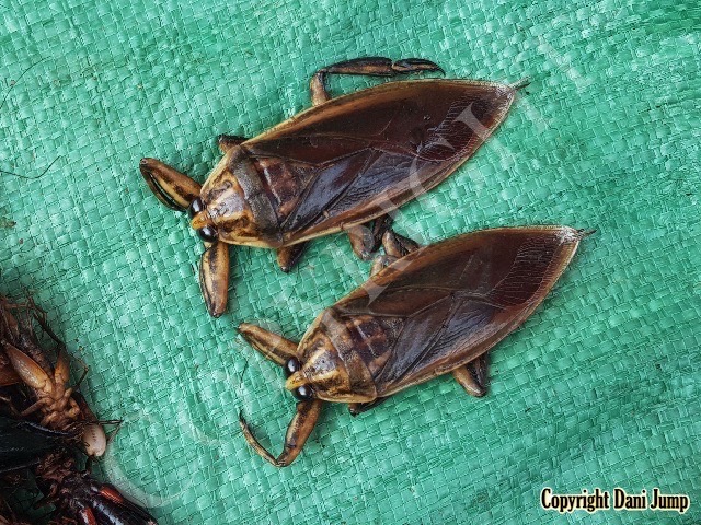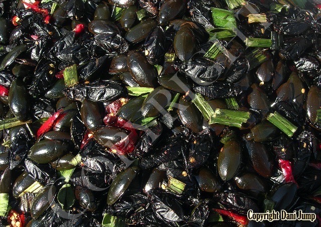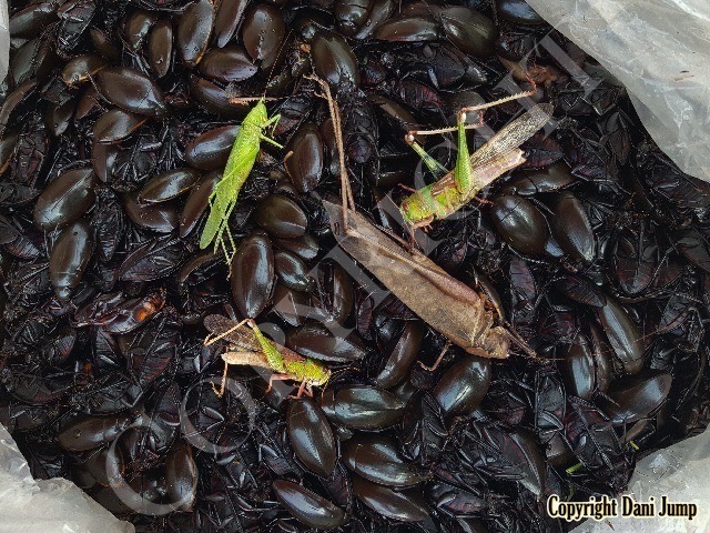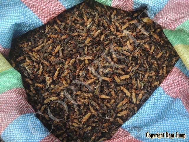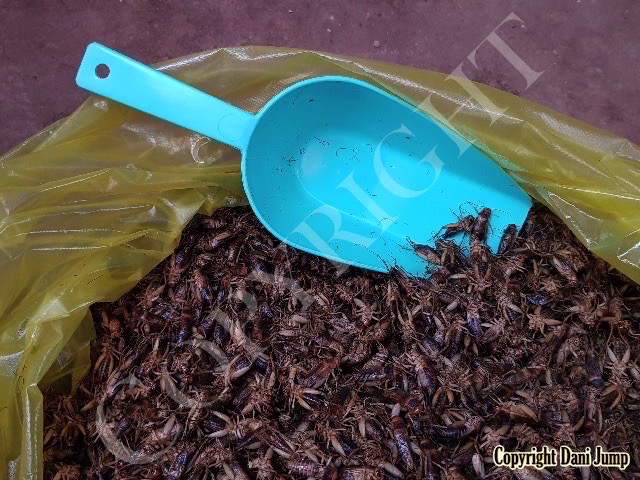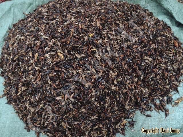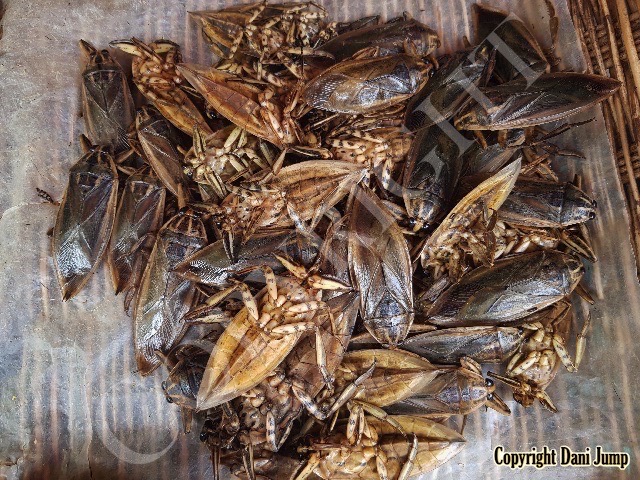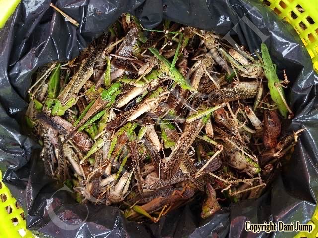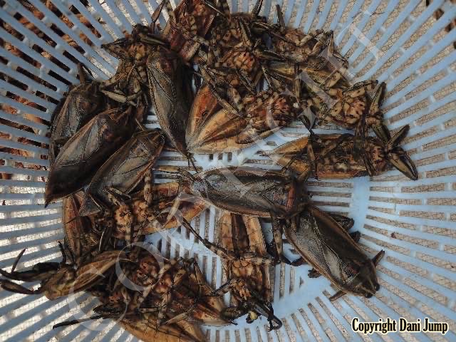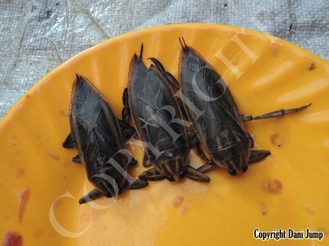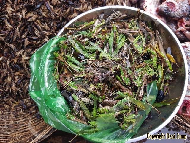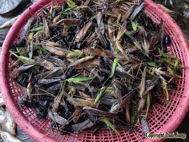 Below are some 'snack food' samples from Siem Reap… abundant particularly during the rainy season, when grasshoppers, crickets, beetles, and bugs are collected at light traps, then taken by bag, basket, or bucket to local markets, and sold raw or deep-fried-and-ready-to-eat, garnished with spring onions, garlic, chillies, and seasoning salt.