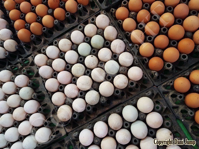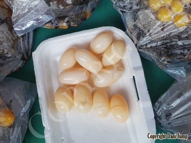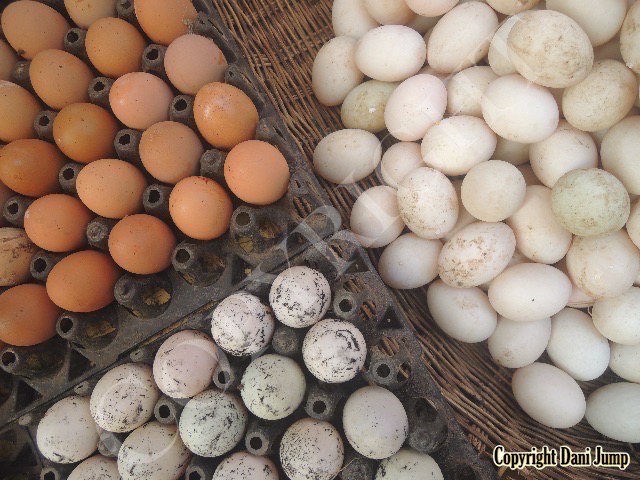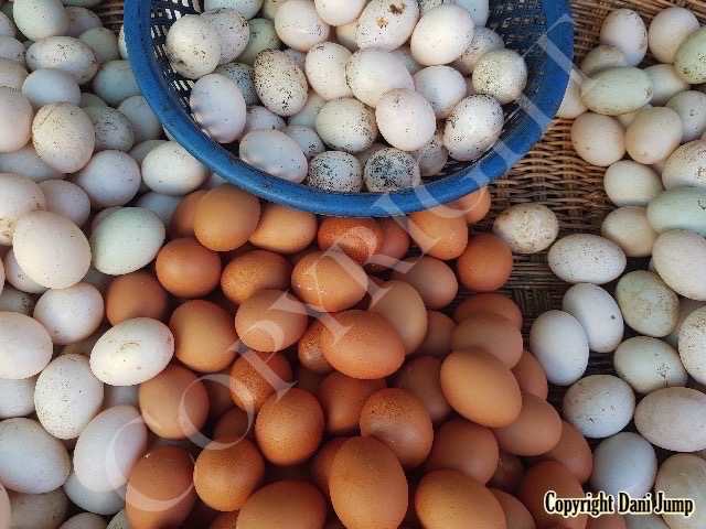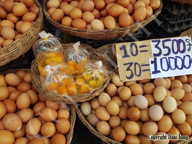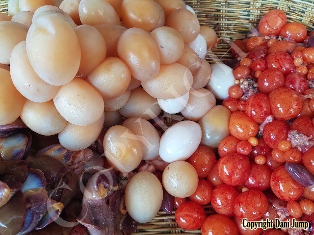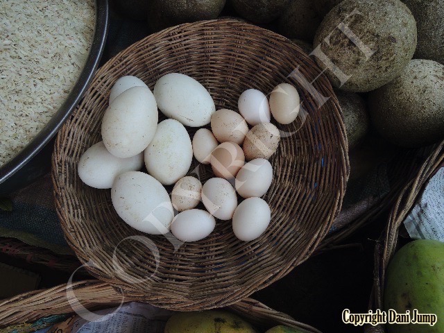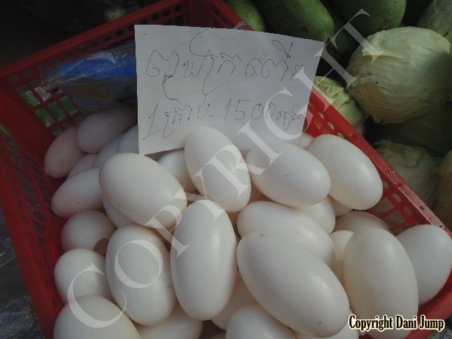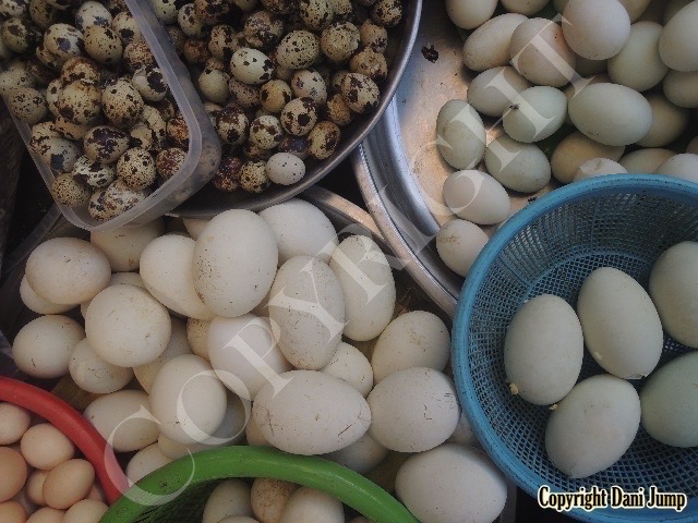 Fish, chicken, duck, goose, quail, turtle, and crocodile eggs can all be purchased fresh, at local markets, when in season; and snake, duck, and frog embryos are also available.