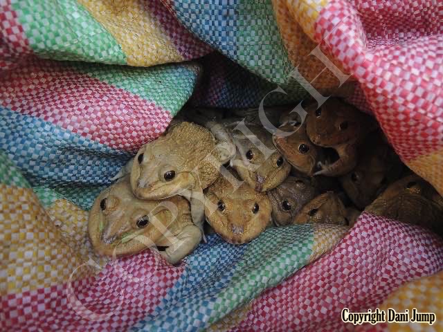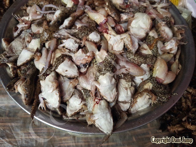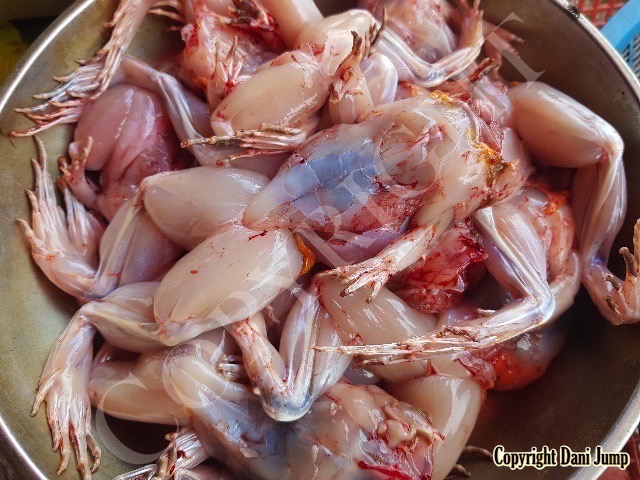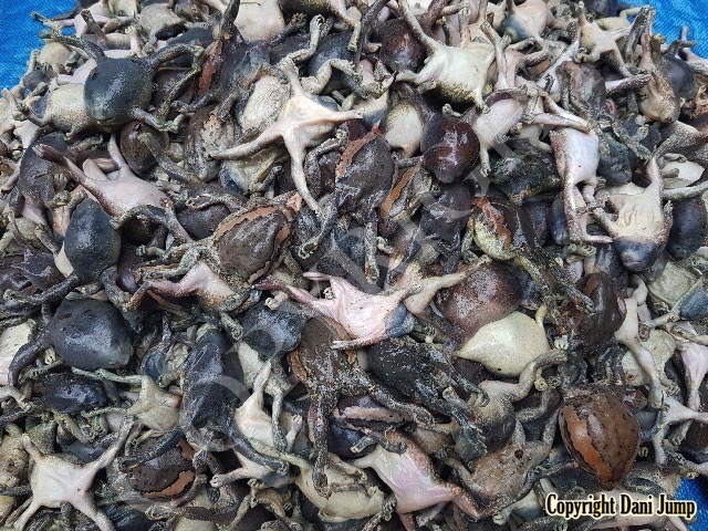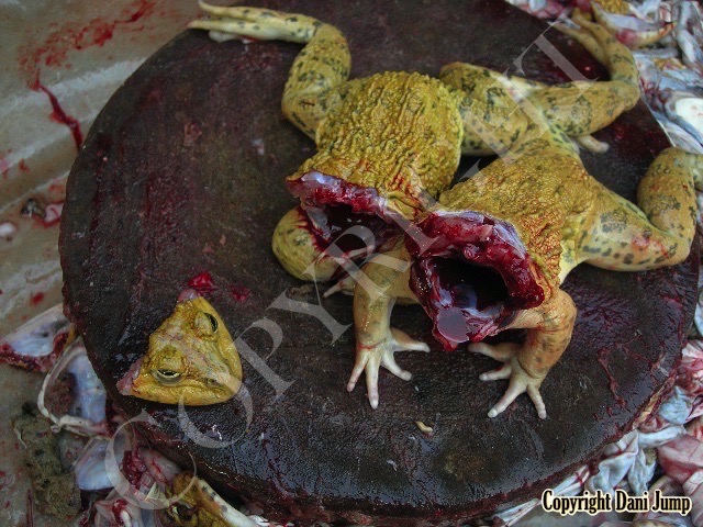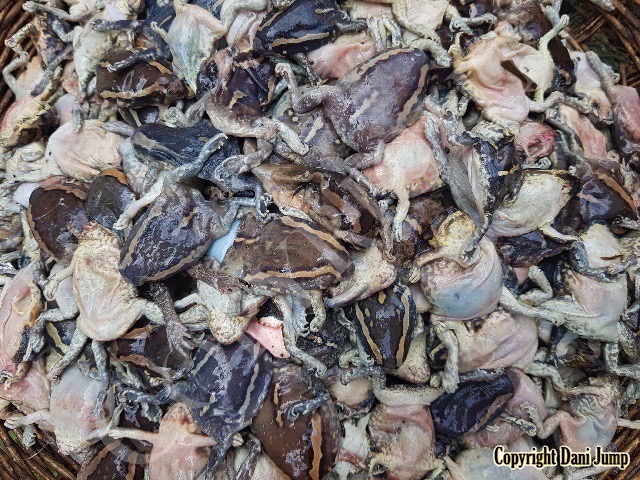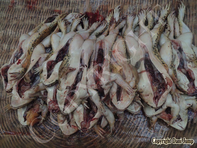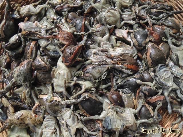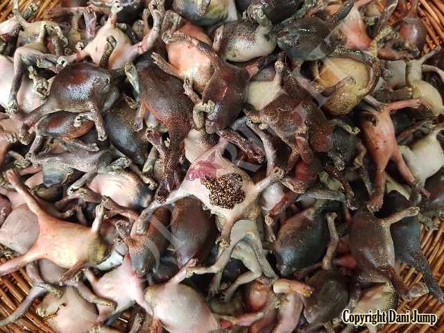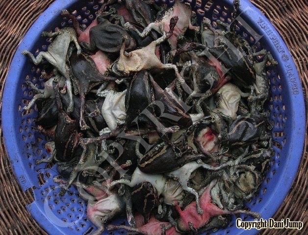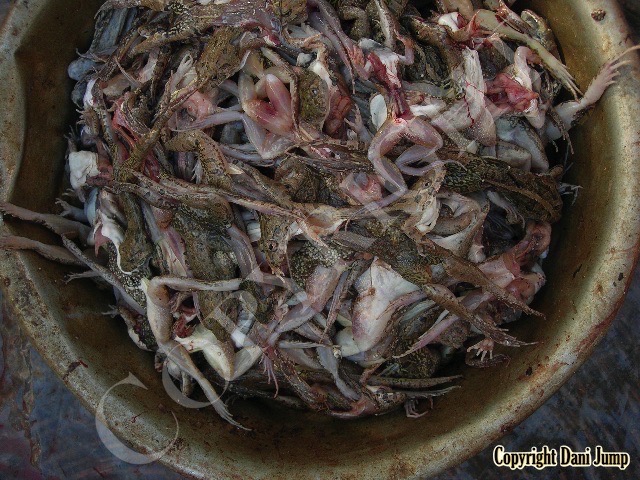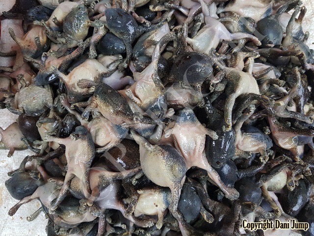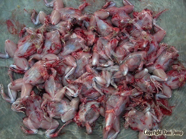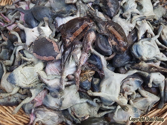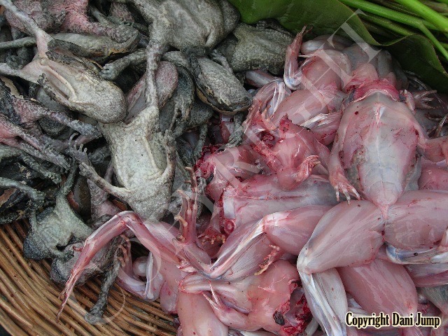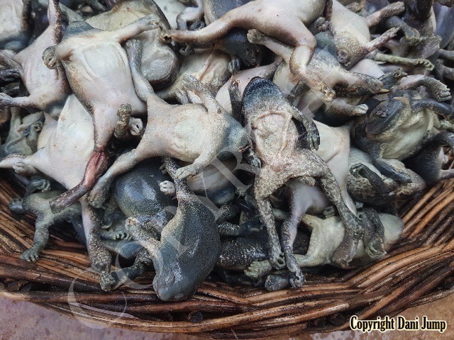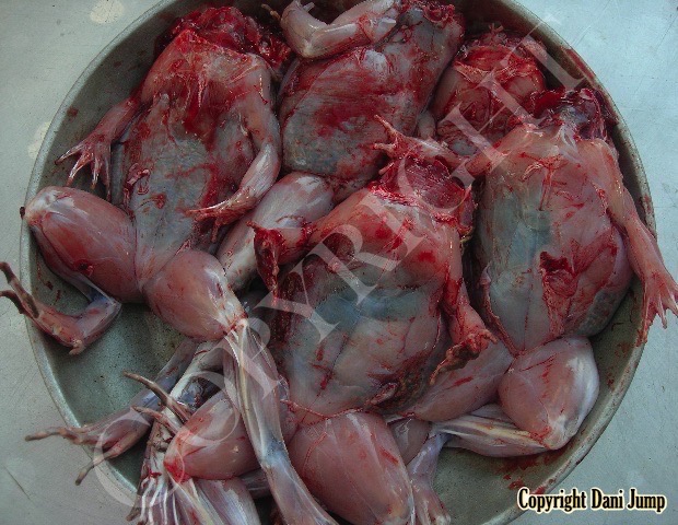 Abundant in the rainy season, frogs and toads are caught, decapitated, skinned, and sold at local markets.