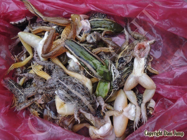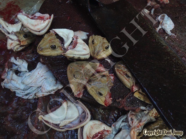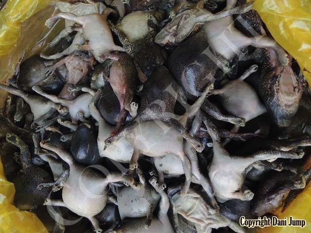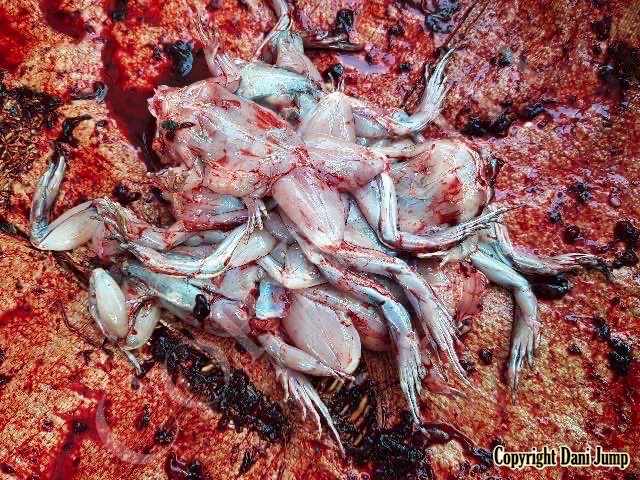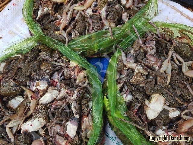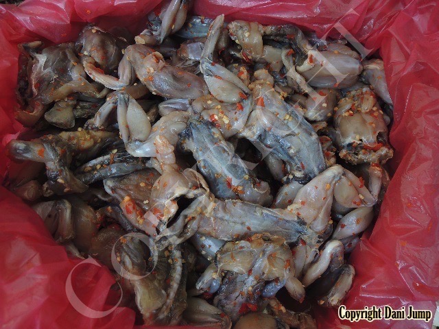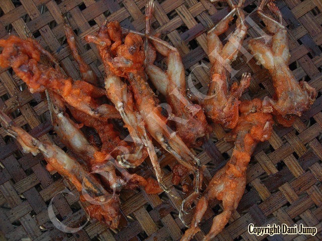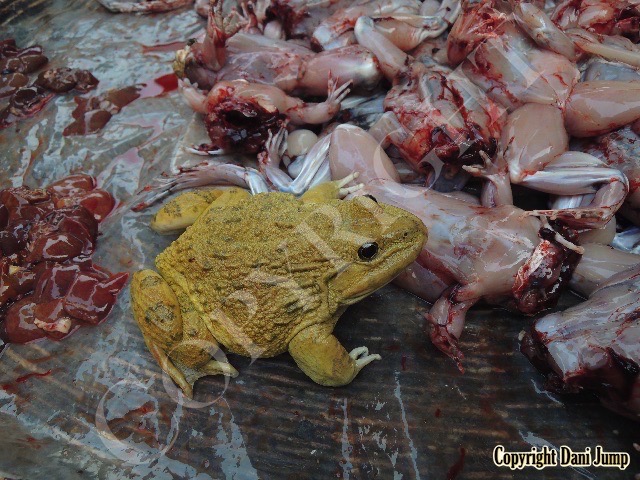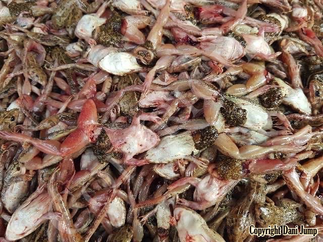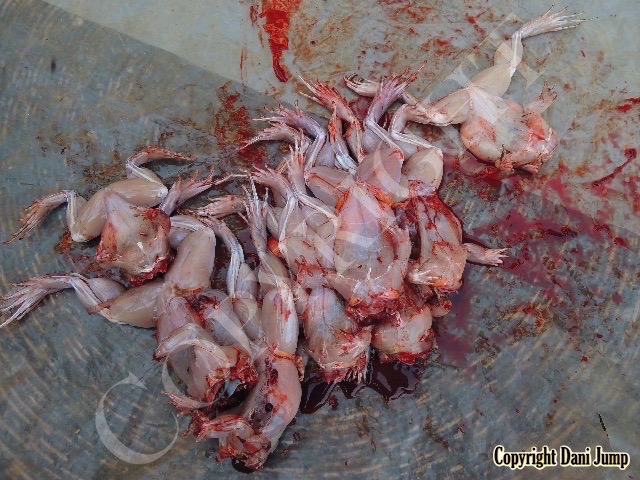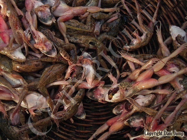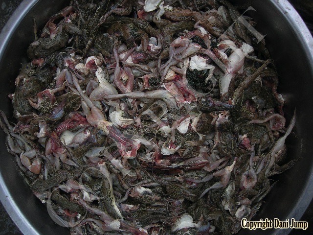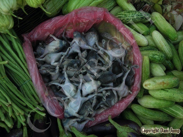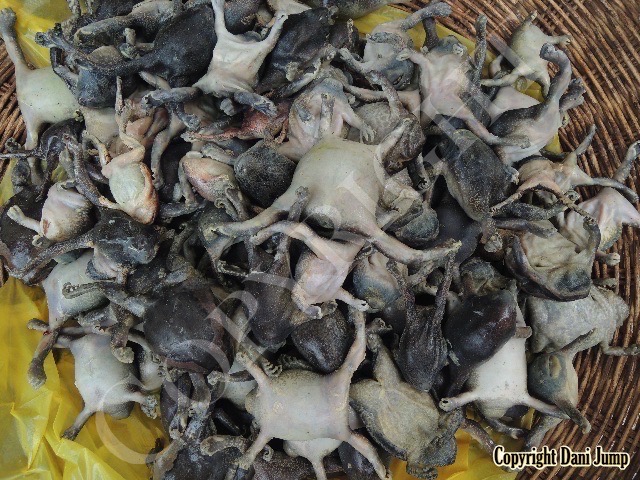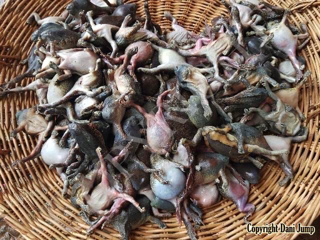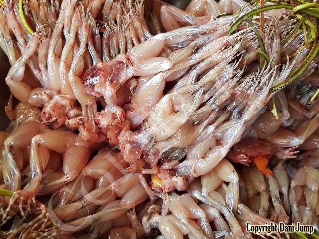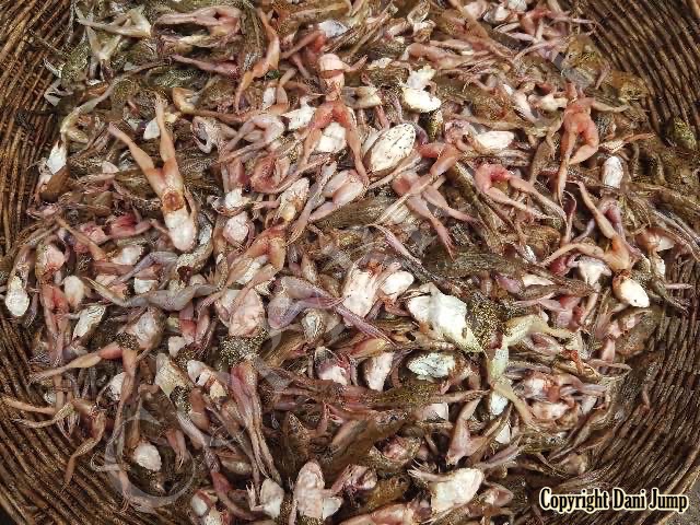 Abundant in the rainy season, frogs and toads are caught, decapitated, skinned, and sold at local markets.
