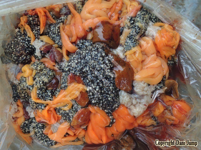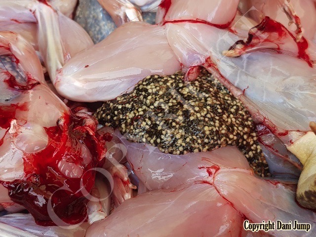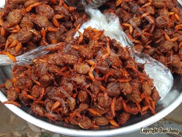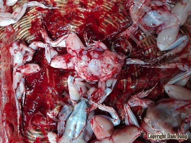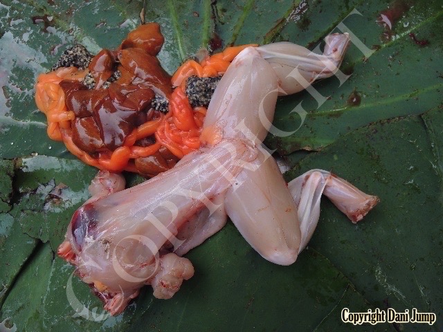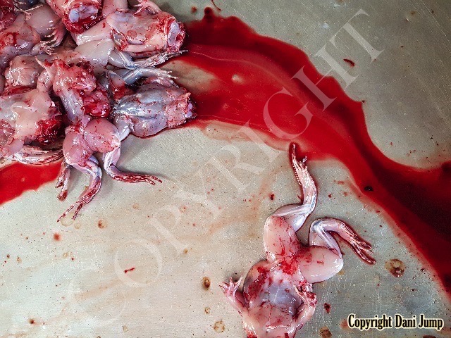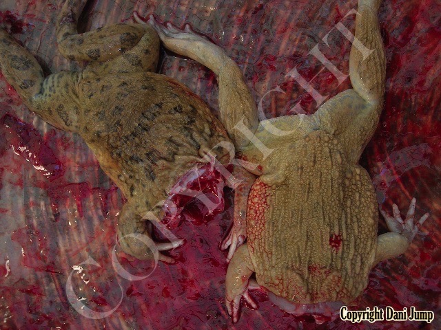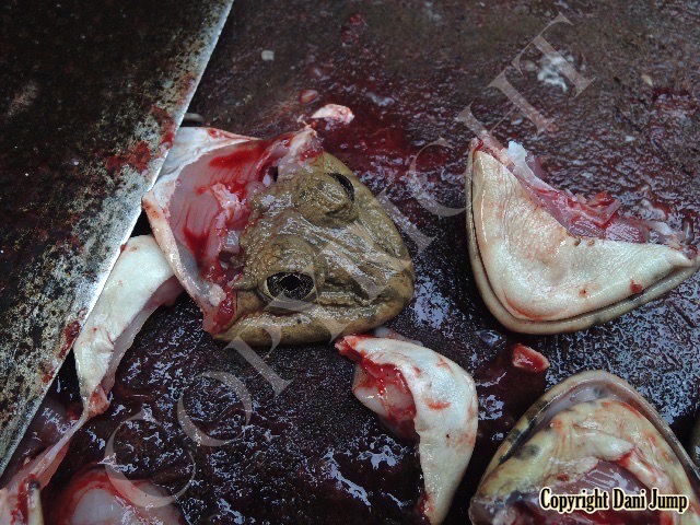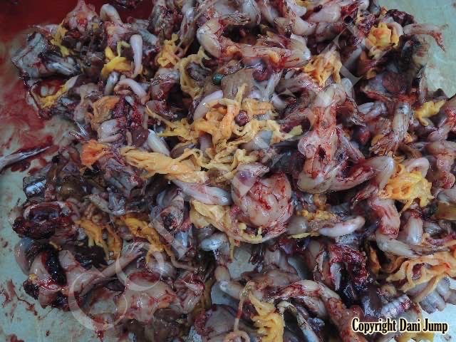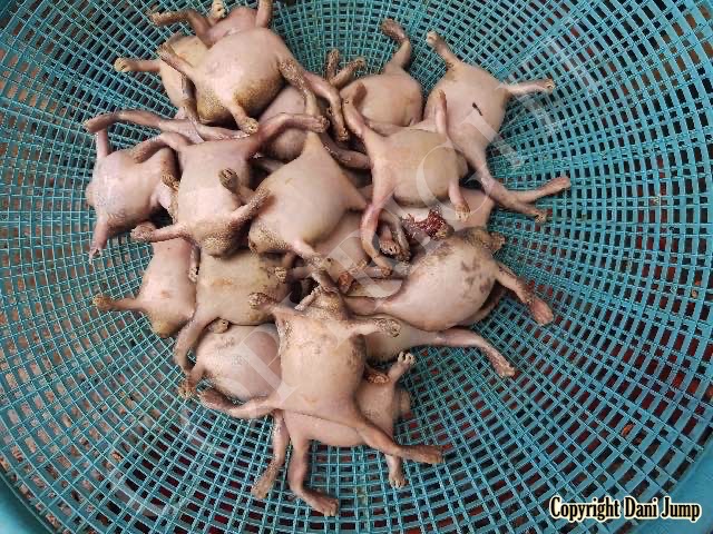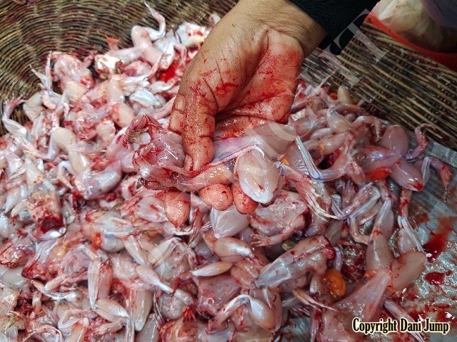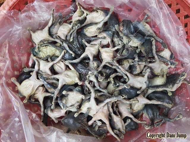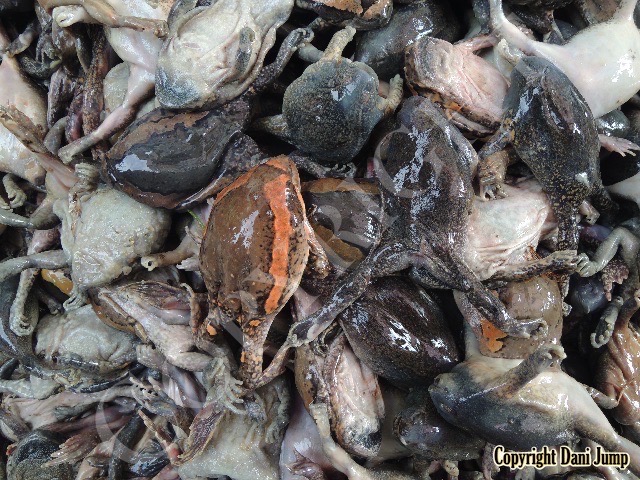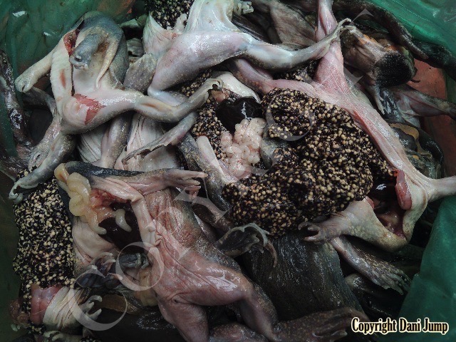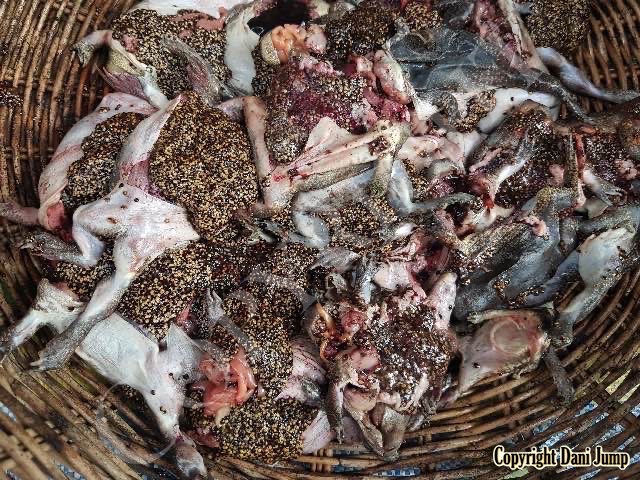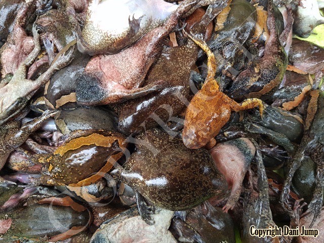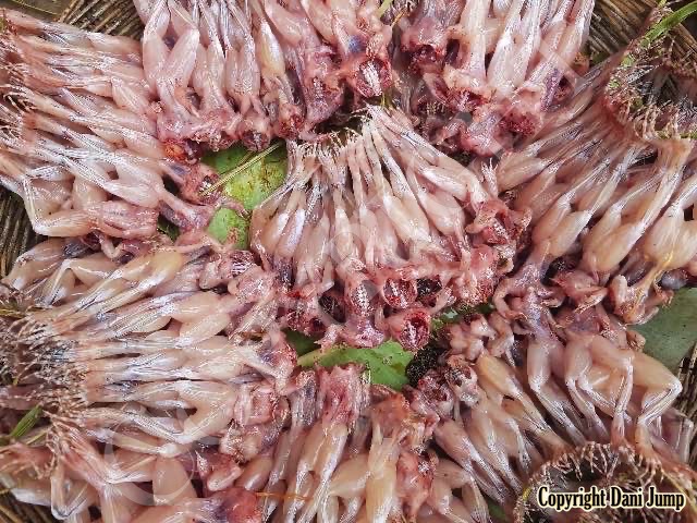 Abundant in the rainy season, frogs and toads are caught, decapitated, skinned, and sold at local markets.