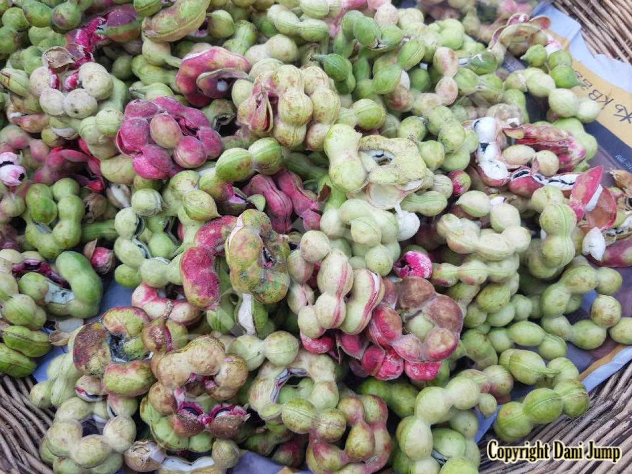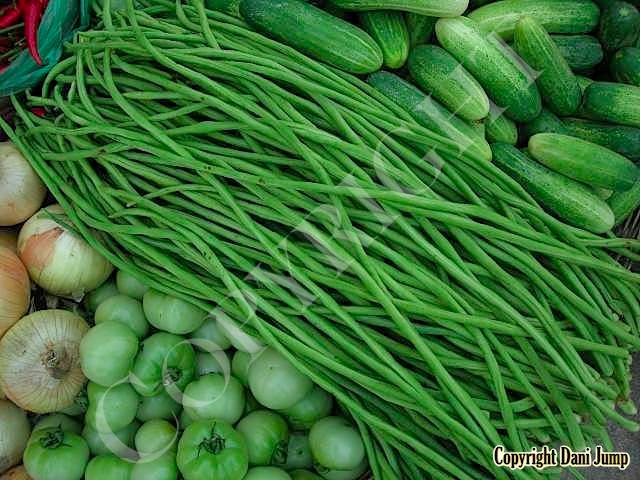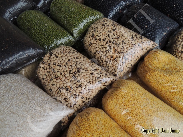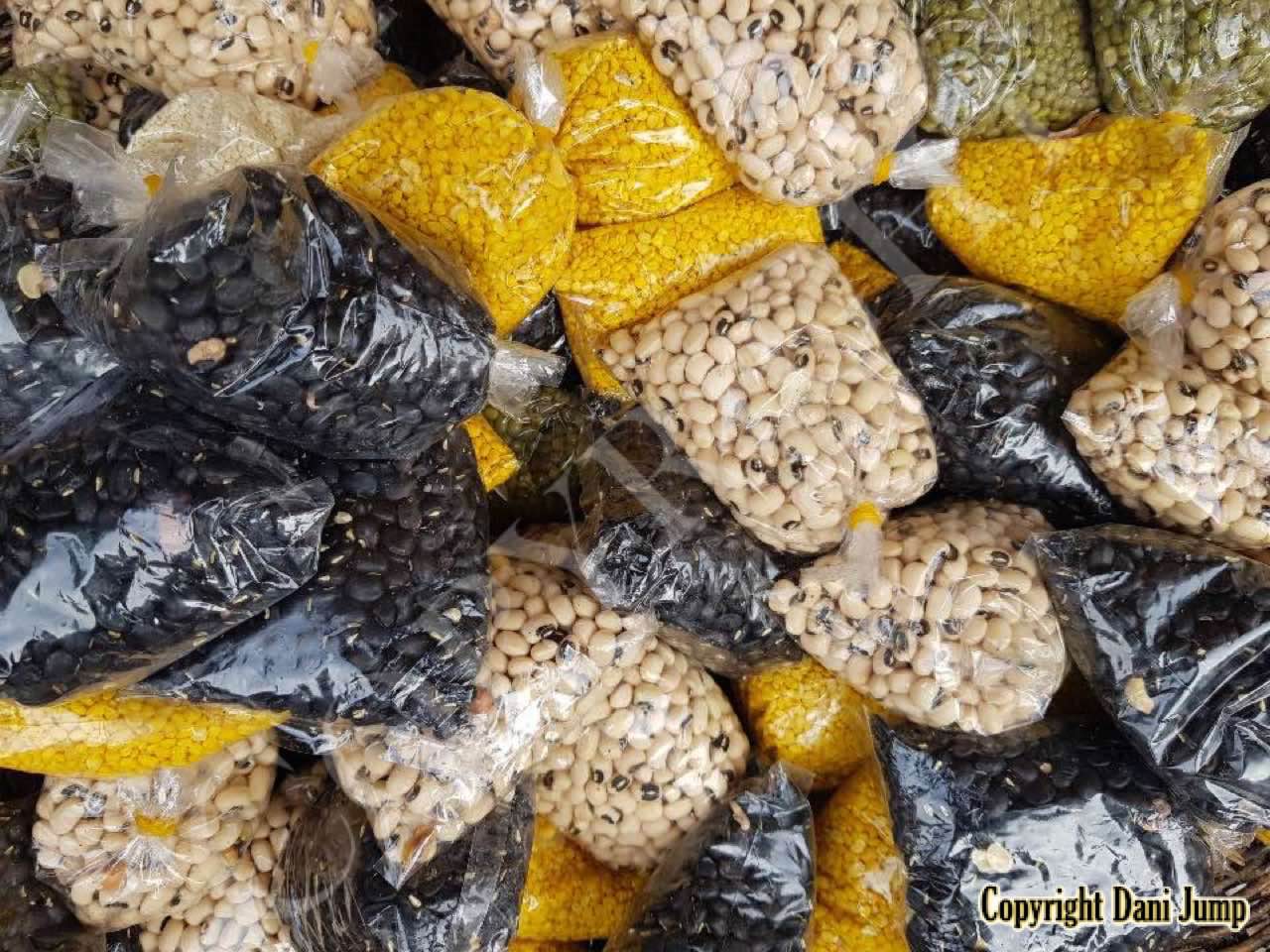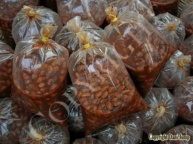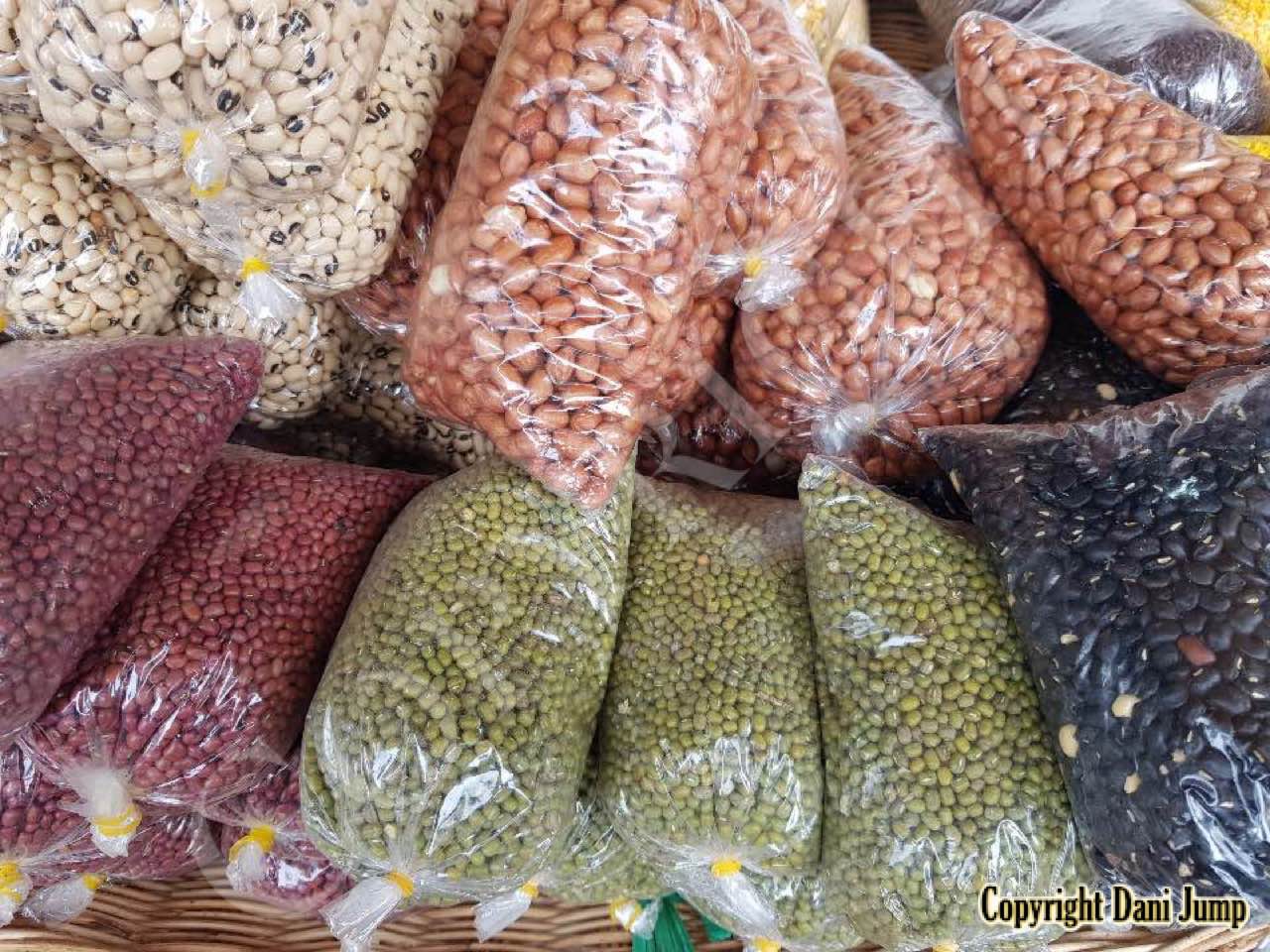 Snake beans, string beans, and winged beans, are common in local markets and are eaten as a main dish. Dried beans, on the other hand, are used less as a main dish and more as an ingredient in desserts, soaked to make sprouts, as is the case with mung beans; or ground (soya) to make tofu. Peanuts are sold raw, steamed, or roasted.
