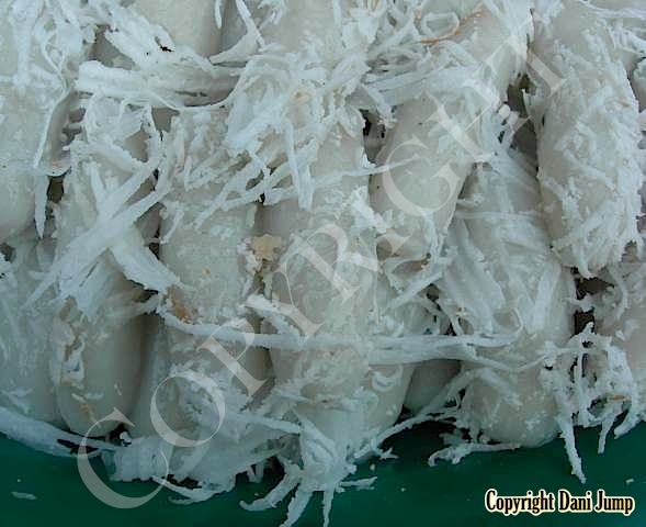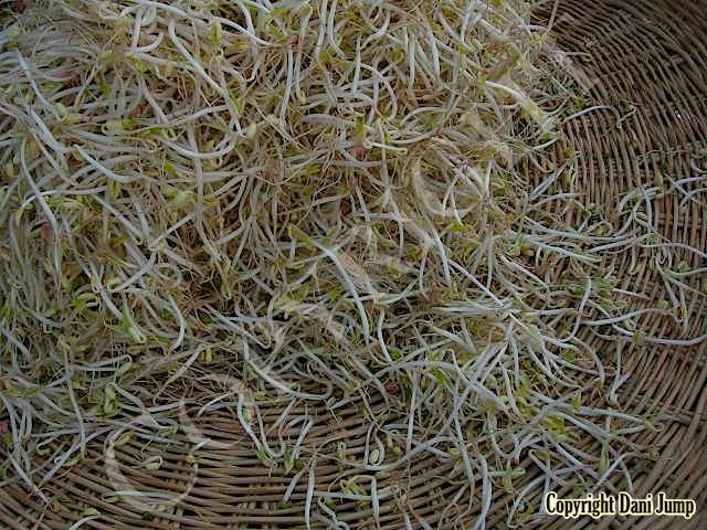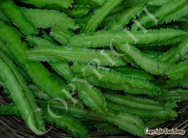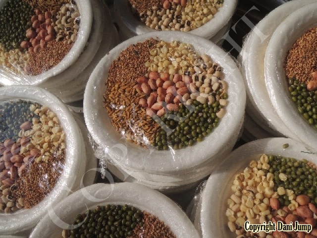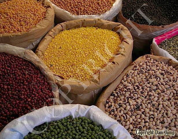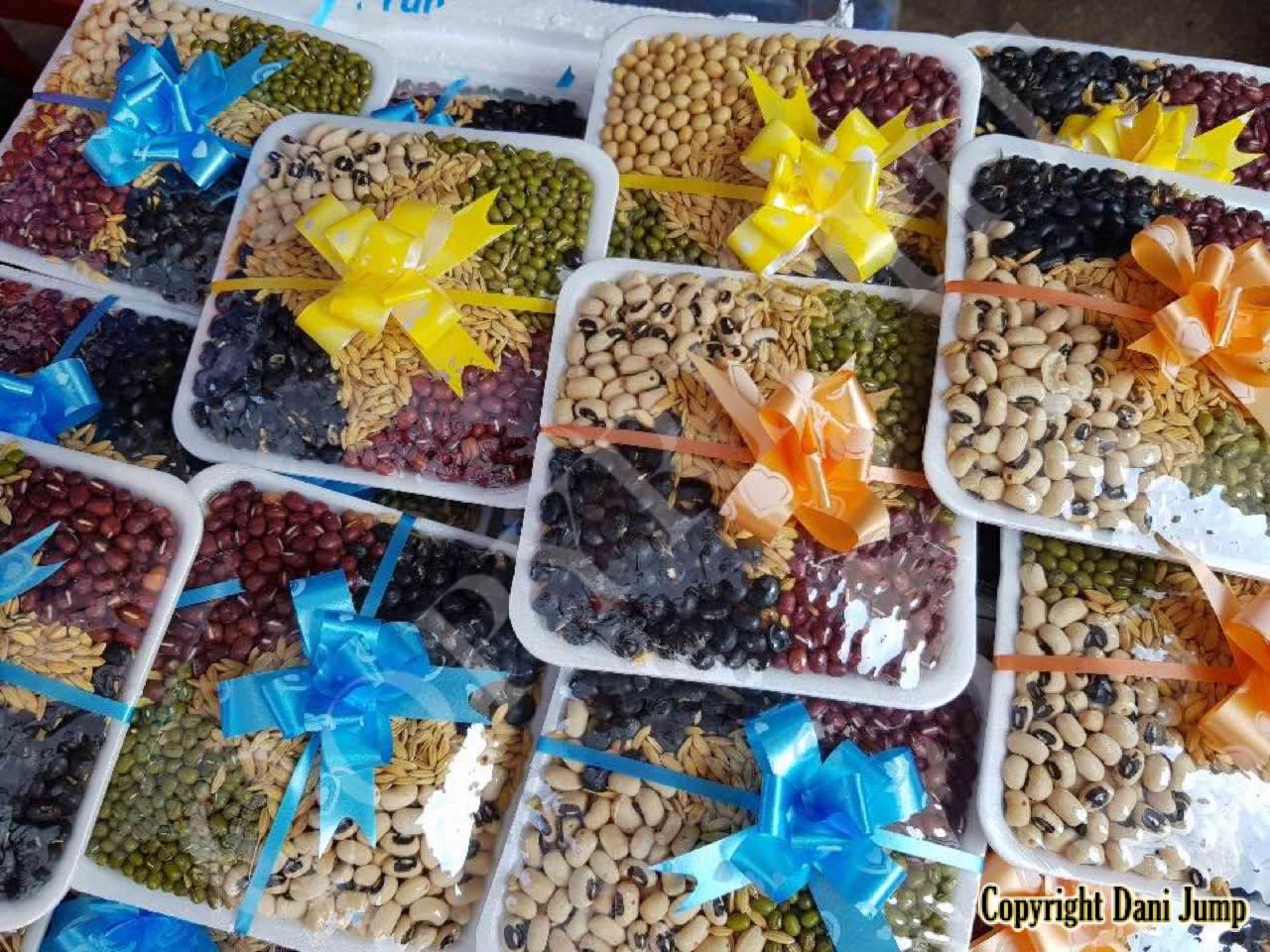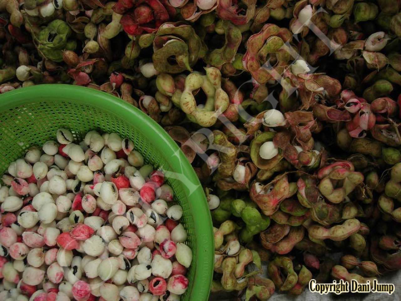 Snake beans, string beans, and winged beans, are common in local markets and are eaten as a main dish. Dried beans, on the other hand, are used less as a main dish and more as an ingredient in desserts, soaked to make sprouts, as is the case with mung beans; or ground (soya) to make tofu. Peanuts are sold raw, steamed, or roasted.