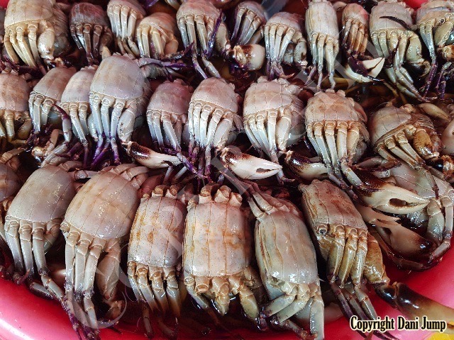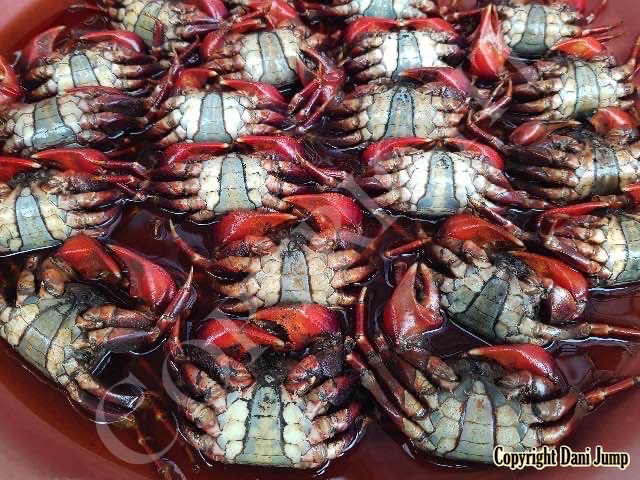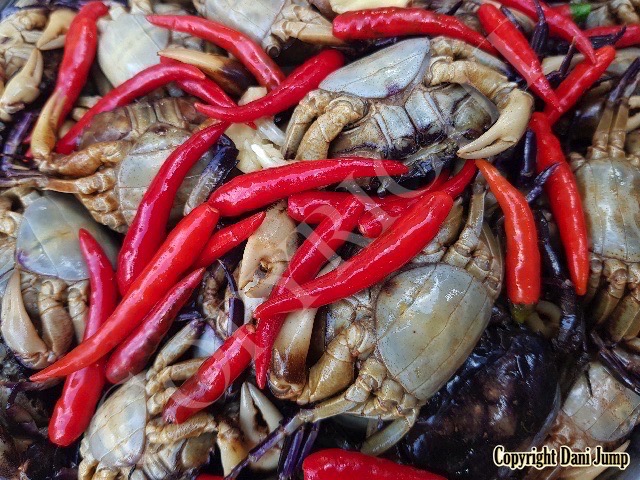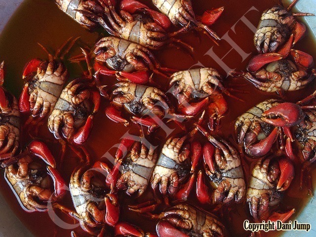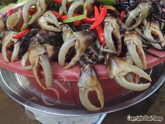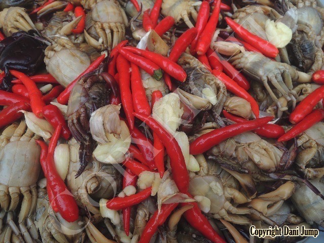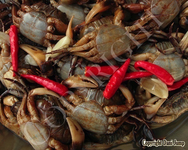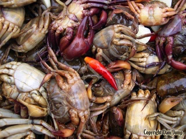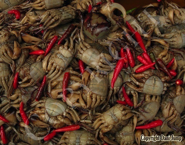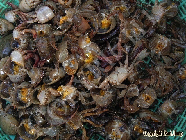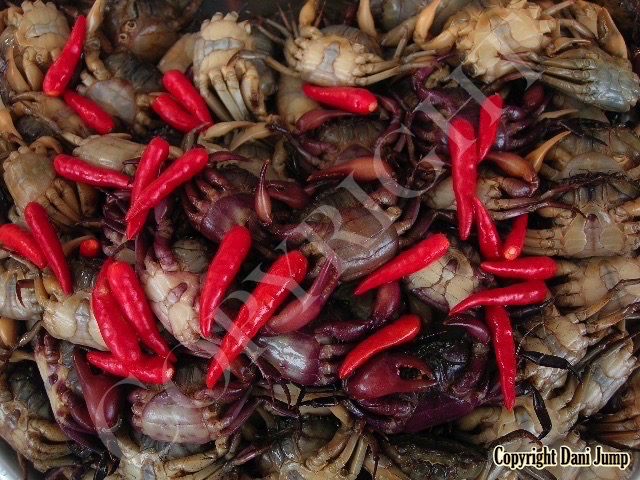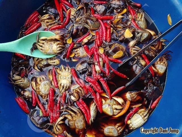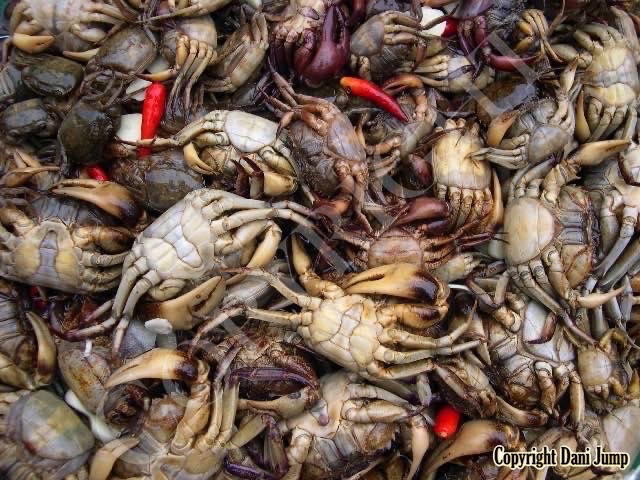 Abundant during the rainy season, both rice field and mangrove crabs flood local markets, and are sold live, dead, spiced, pickled, as a paste, or grilled. There's not much meat in them, but the locals love 'em, nevertheless--particularly when downed with loads of chilli and garlic!