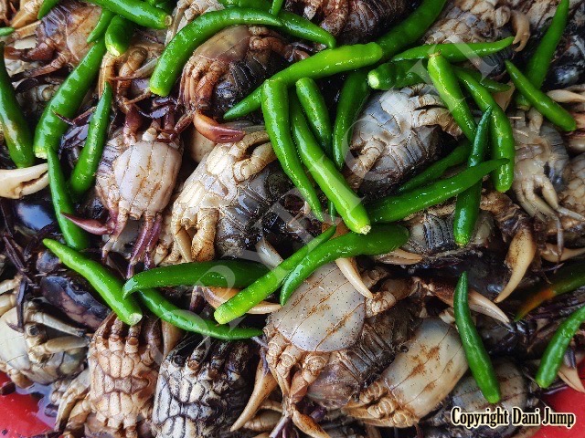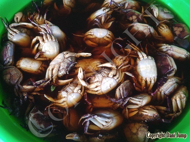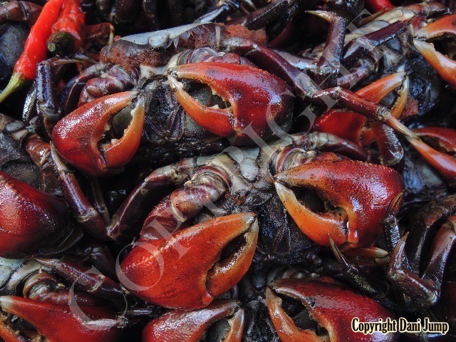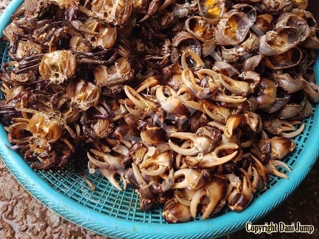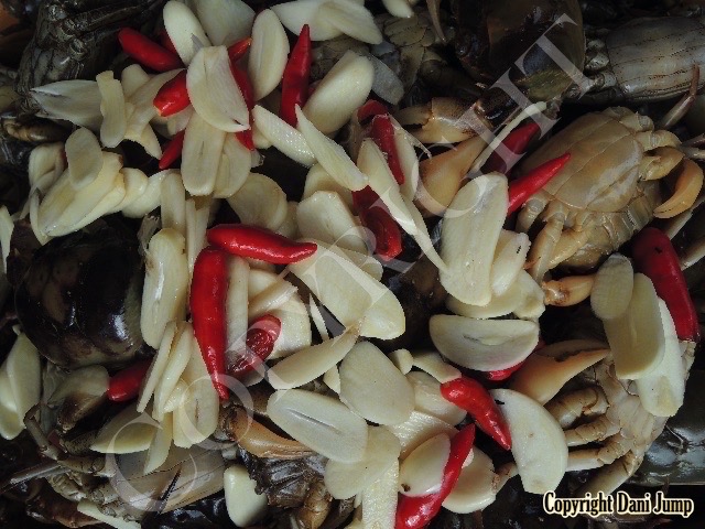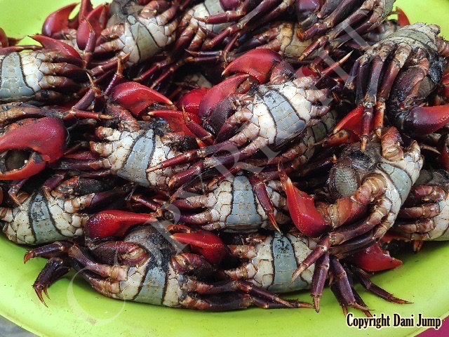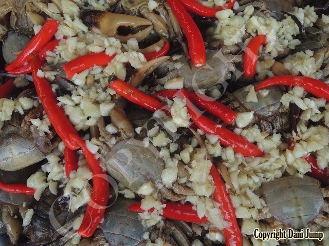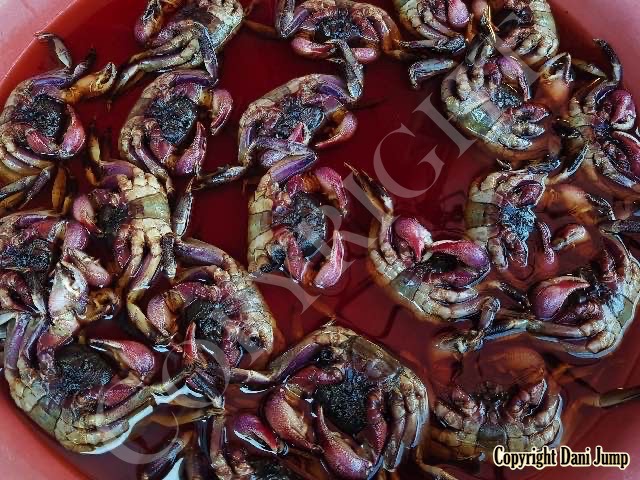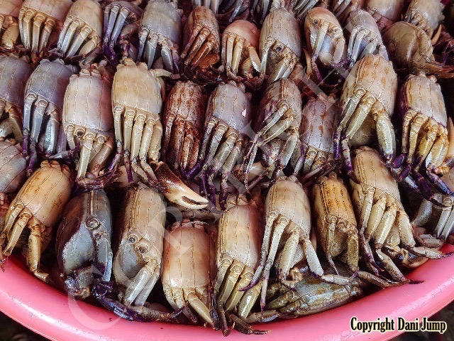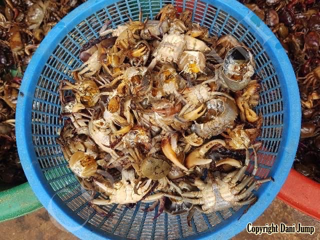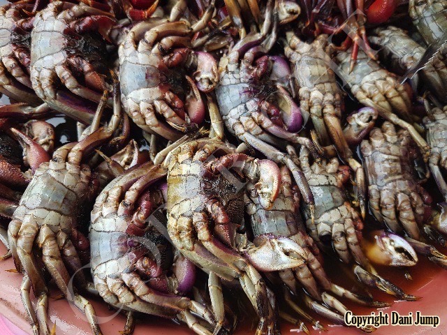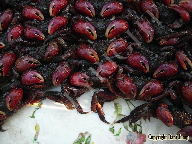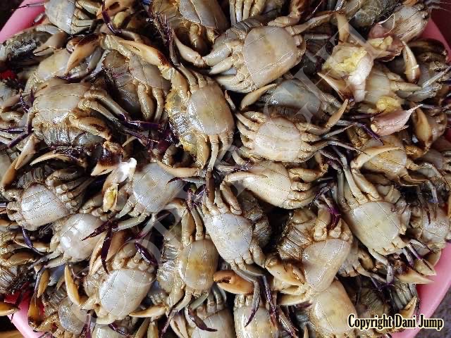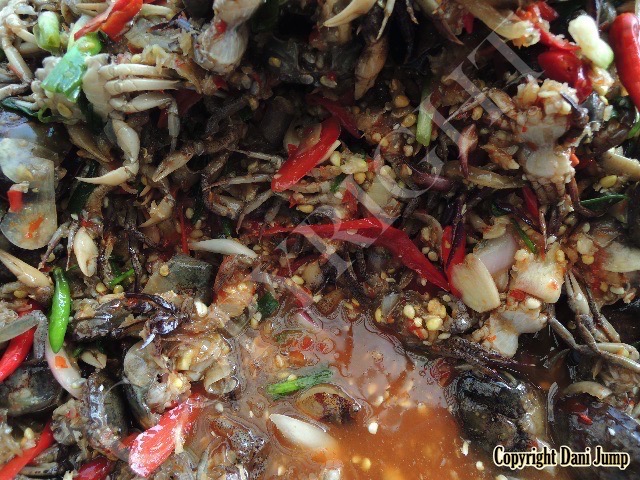 Abundant during the rainy season, both rice field and mangrove crabs flood local markets, and are sold live, dead, spiced, pickled, as a paste, or grilled. There's not much meat in them, but the locals love 'em, nevertheless--particularly when downed with loads of chilli and garlic!