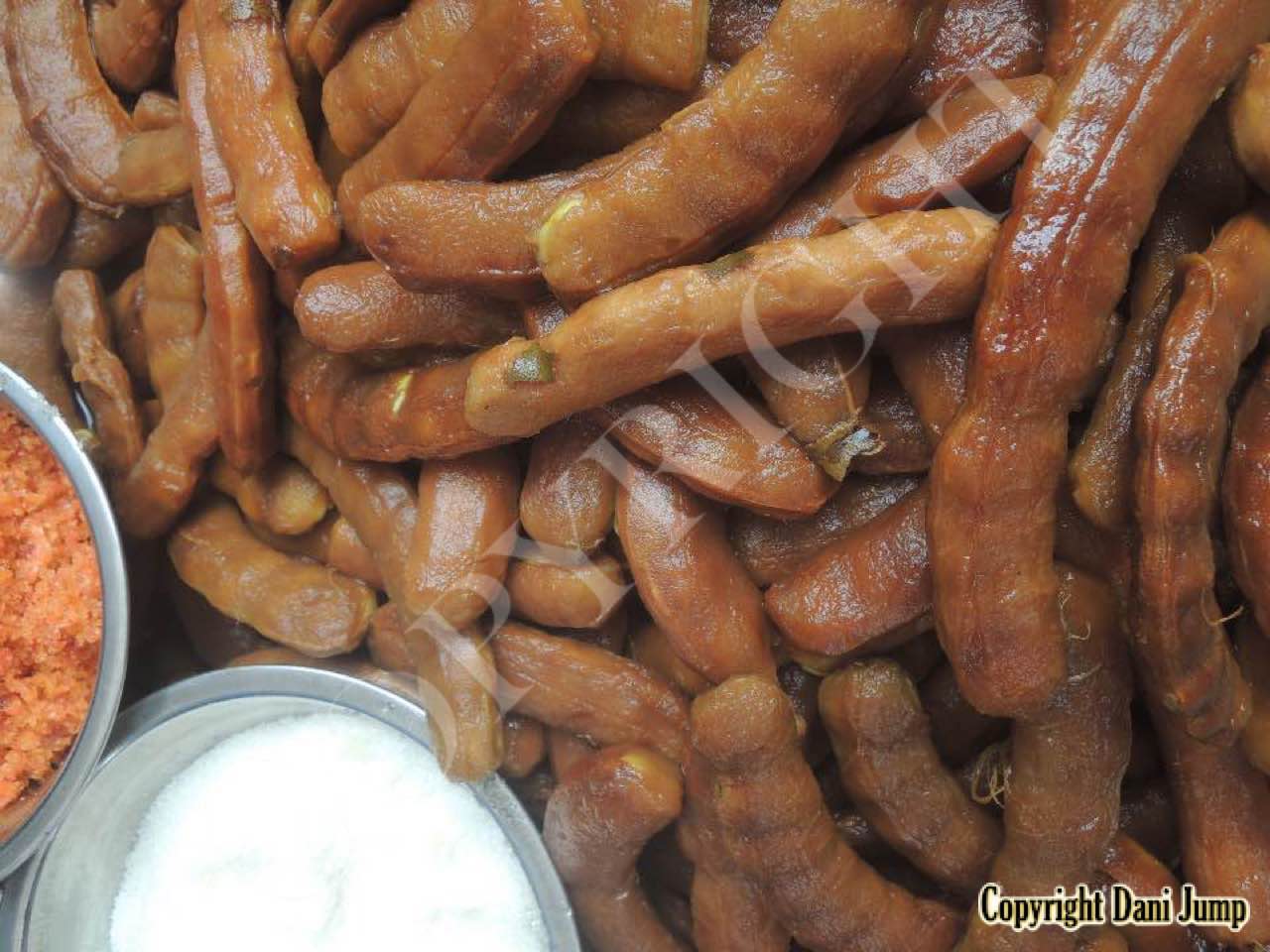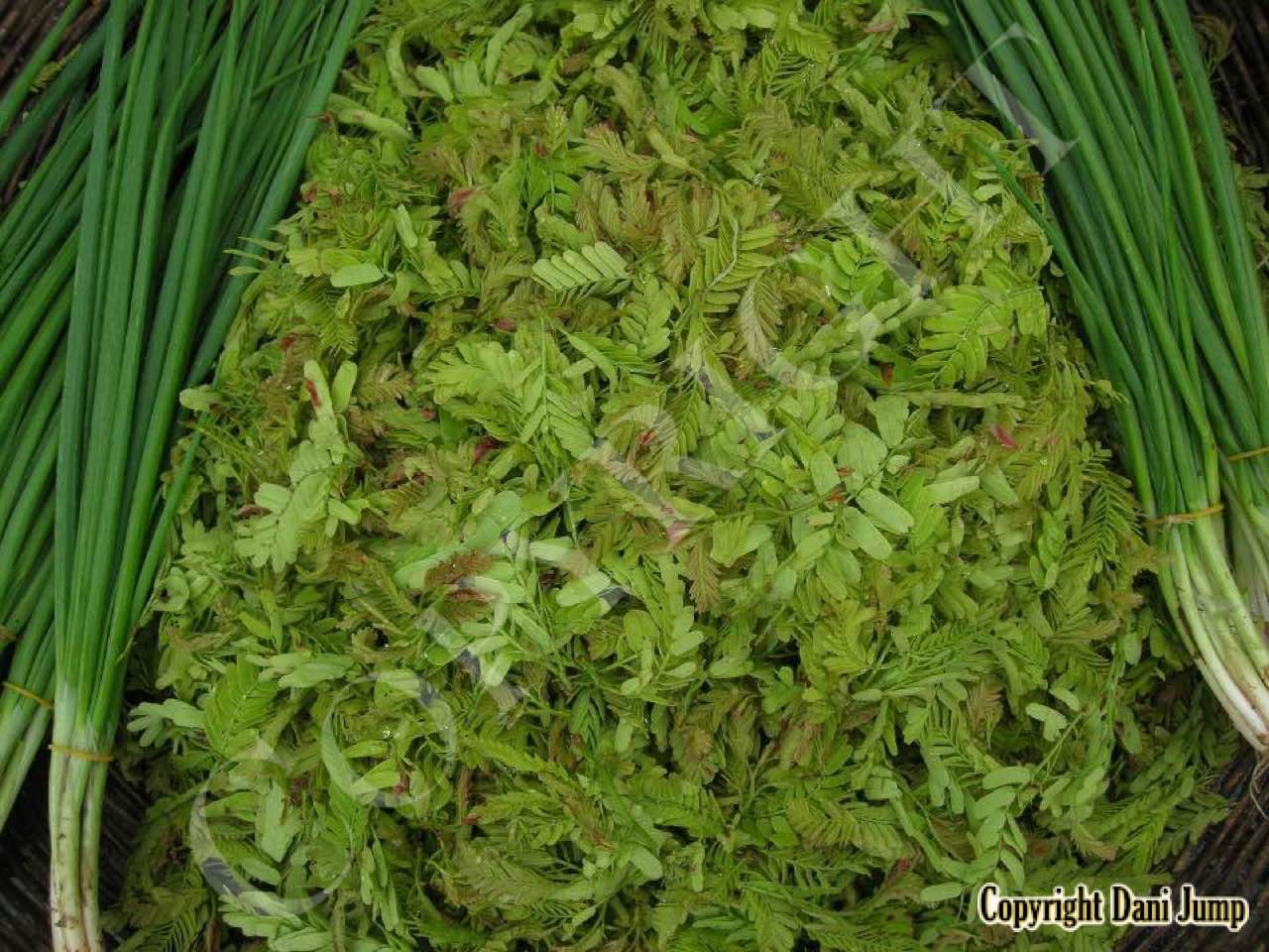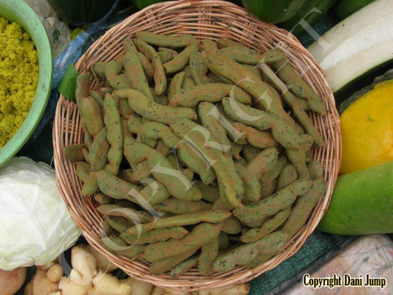 Tamarind (Tamarindus indica)... the mouth often waters at the sound! The fruit is common at markets throughout Cambodia, and can be found in many forms: sweet, sour, pickled, green, ripe, sugared and spiced, and as a paste. The flowers and young leaves are eaten, too.