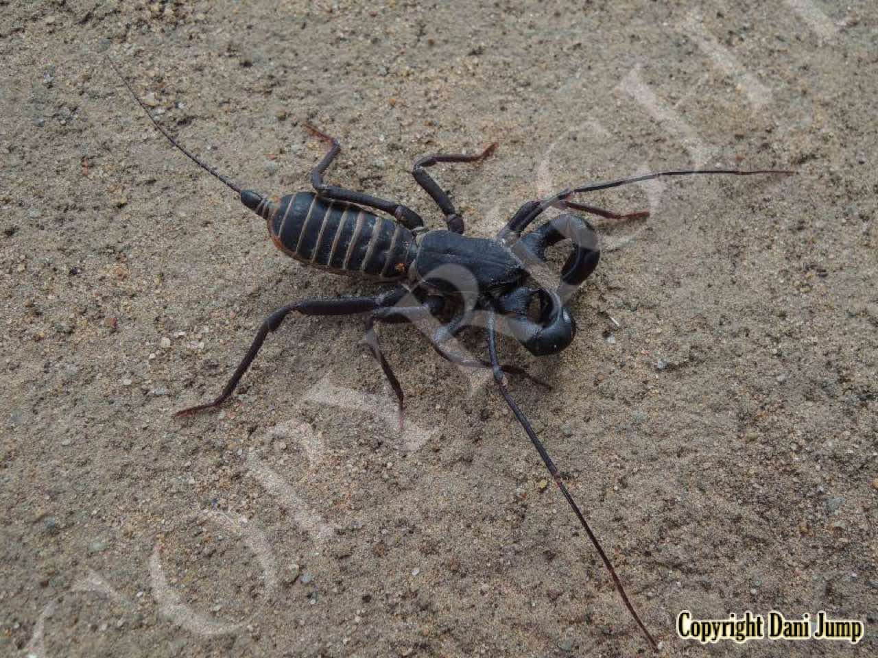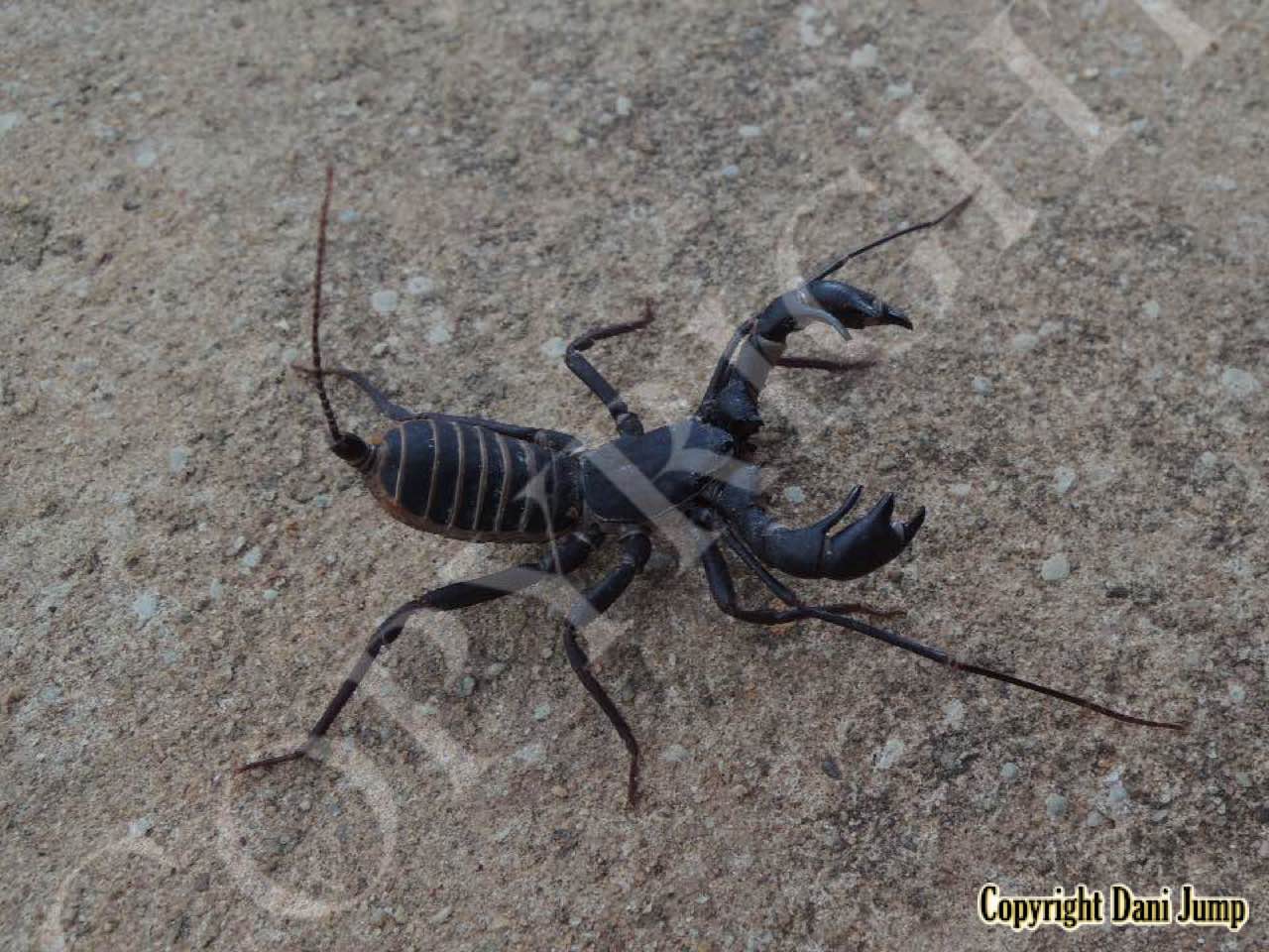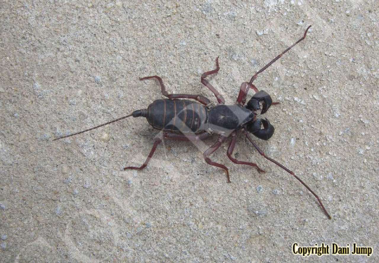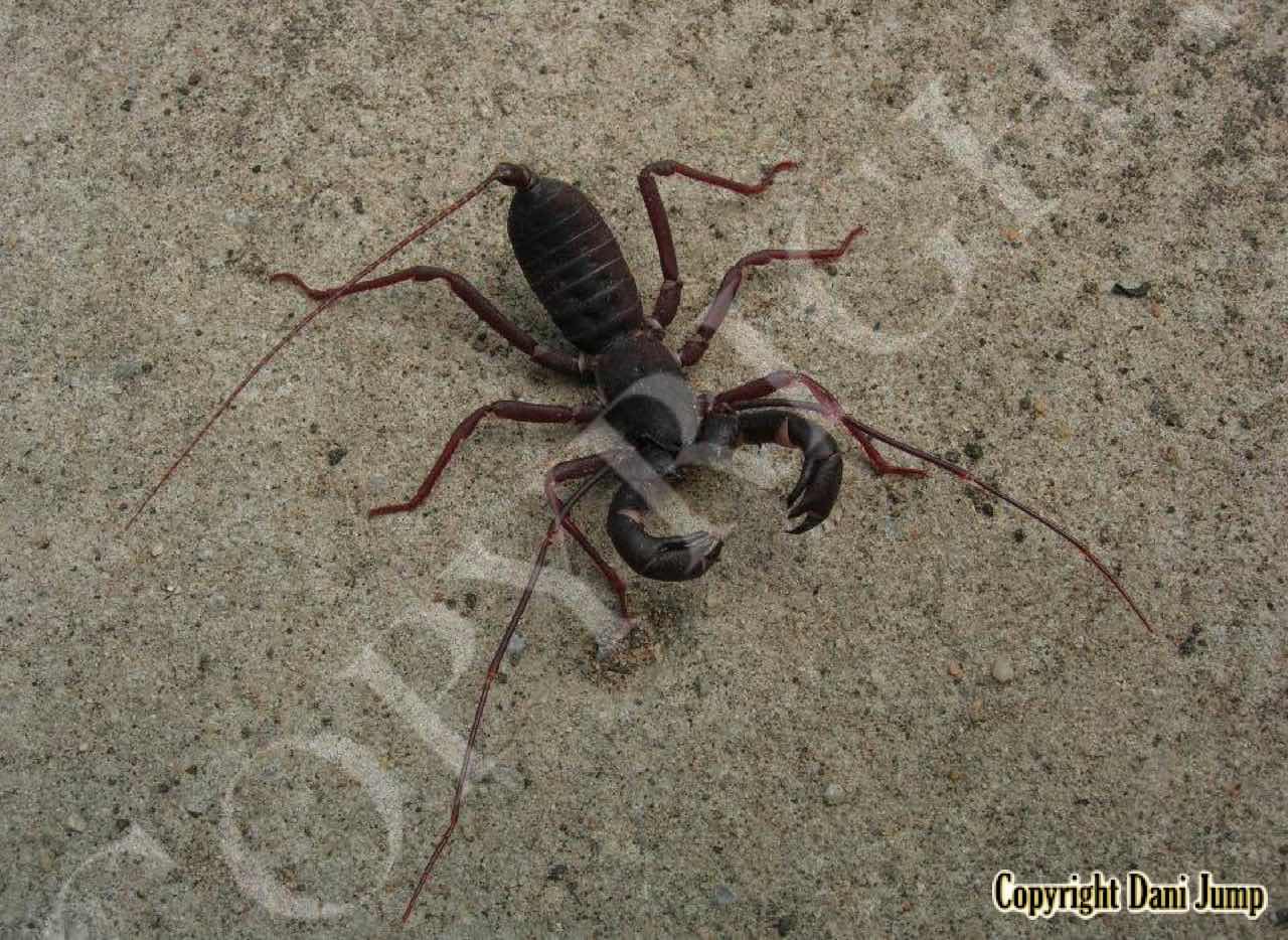 Unlike their “cousins”, which sport stingers and are often found in urban settings, these “false” scorpions, occasionally spotted in wooded areas--particularly during the rainy season--are no more a menace than the acetic acid they tend to share with over-zealous handlers.