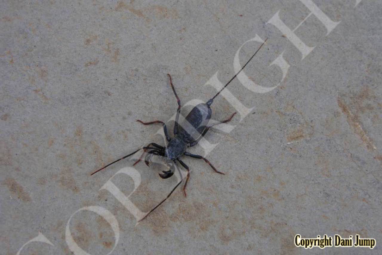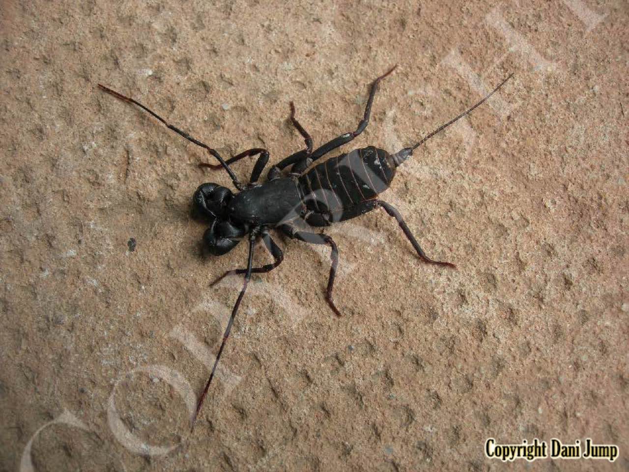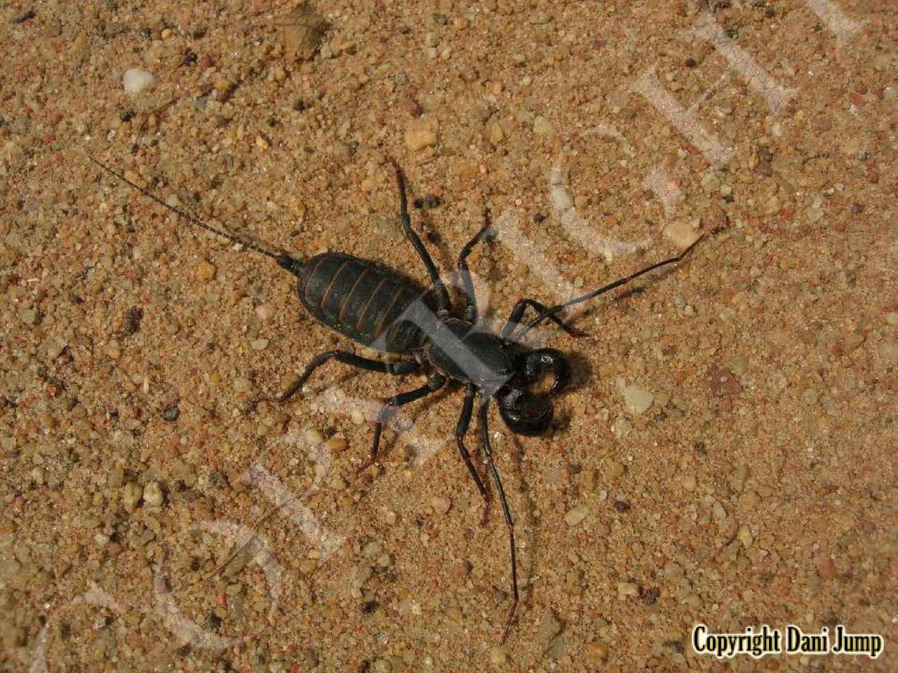 Unlike their “cousins”, which sport stingers and are often found in urban settings, these “false” scorpions, occasionally spotted in wooded areas--particularly during the rainy season--are no more a menace than the acetic acid they tend to share with over-zealous handlers.