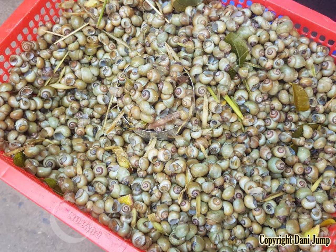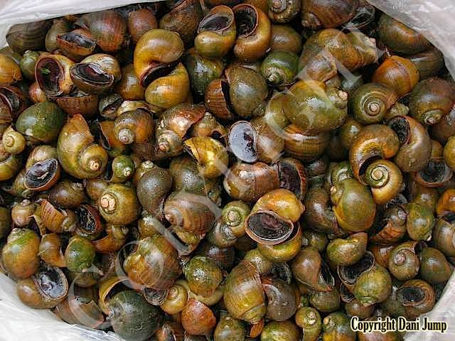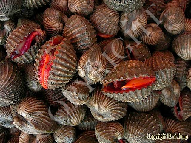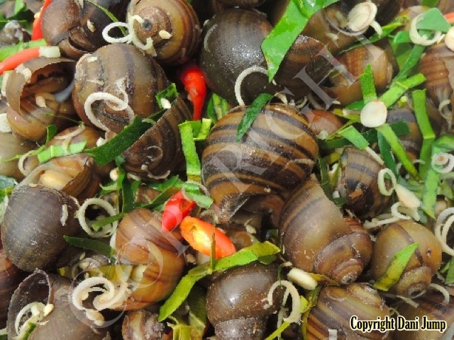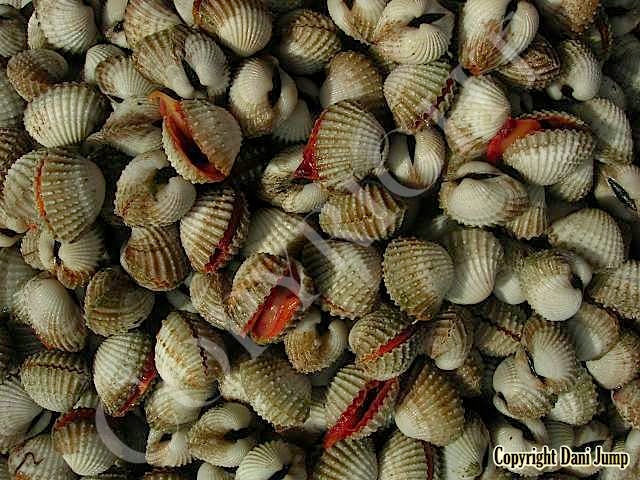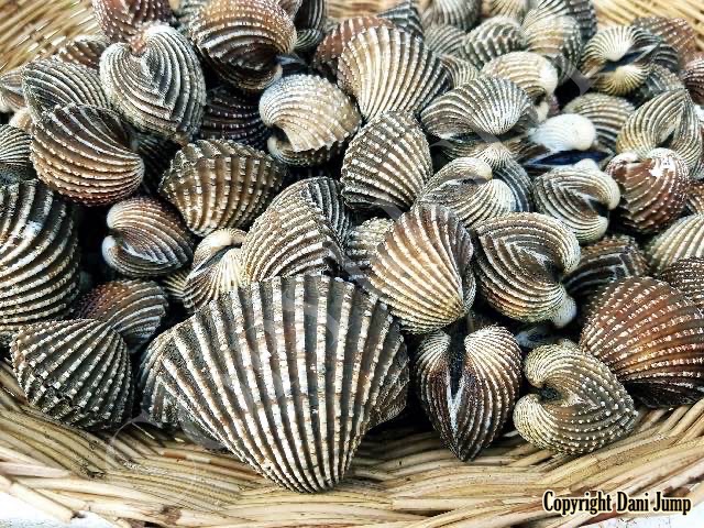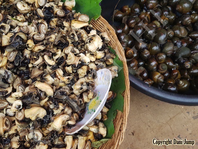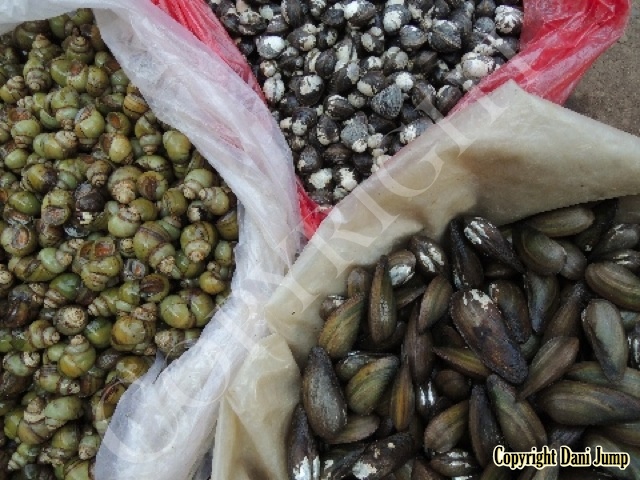Shells--both freshwater and saltwater varieties--are seasonal fare at local markets and along roadsides throughout the country. Steamed, sun-dried, salted and spiced, or cooked, shellfish are just another item on a vast and varied menu of meat that Cambodians love to eat.